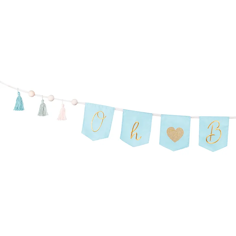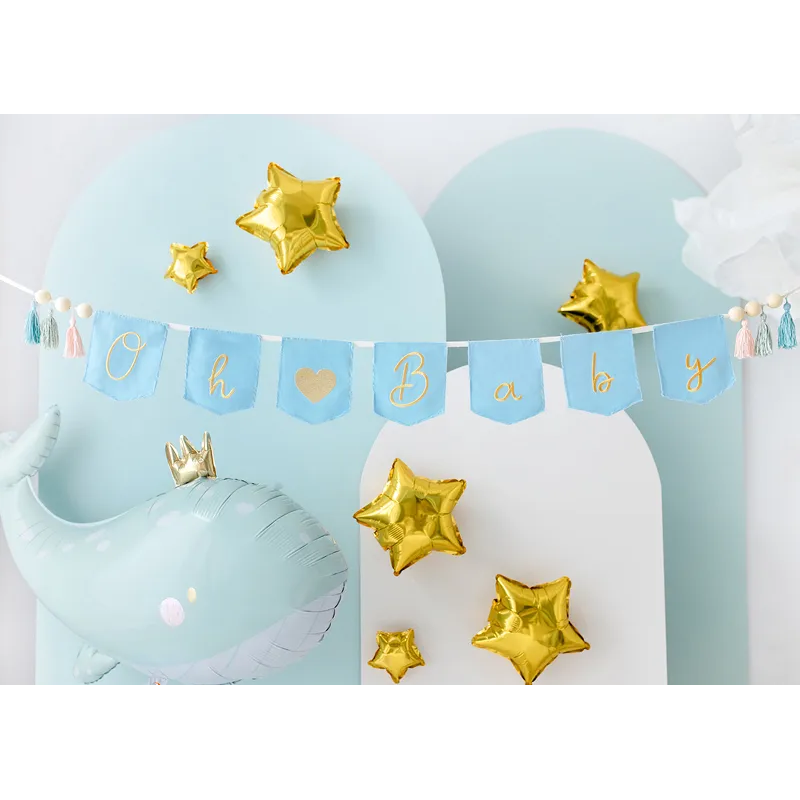 Skapa en mjuk och charmig babyshowerdekoration med denna “Oh Baby”-girlang i ljusblått!