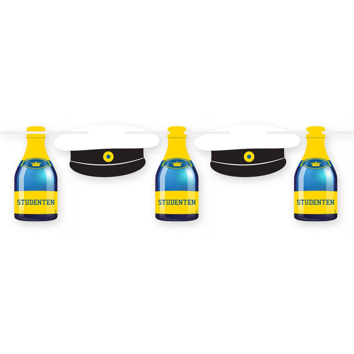 Häng upp en snygg studentgirlang med studentmössor och champagneflaskor på studentfesten. Motiven är i papper och är flyttbara på den 6m långa girlangsnöret. Perfekt för att dekorera upp i partytälten eller i lägenheten. En riktig härlig studentkänsla tack vare studentmössorna och champagneflaskorna i gult och blått.