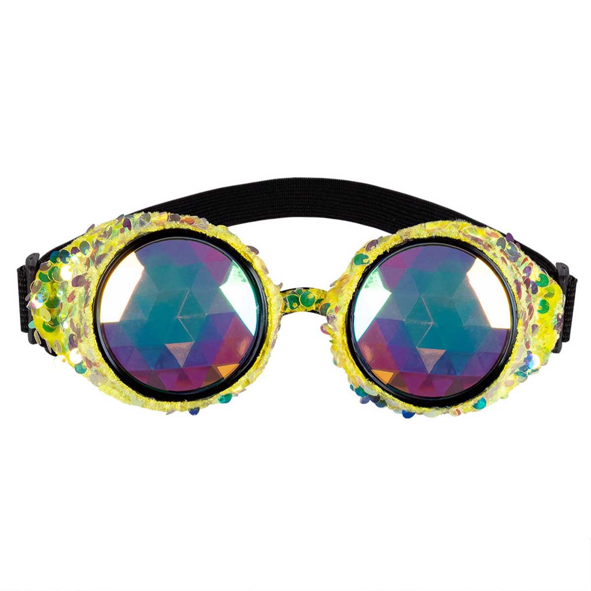 Glasögonen har en elastisk rem för att sitta bekvämt på huvudet och passar alla. Prismaglasen skapar en häftig ljuseffekt som ger dig en magisk upplevelse, oavsett om du dansar på en festival eller minglar på en temafest. Dessa glasögon är det perfekta tillbehöret för att lägga till en touch av mystik och glamour till din outfit.