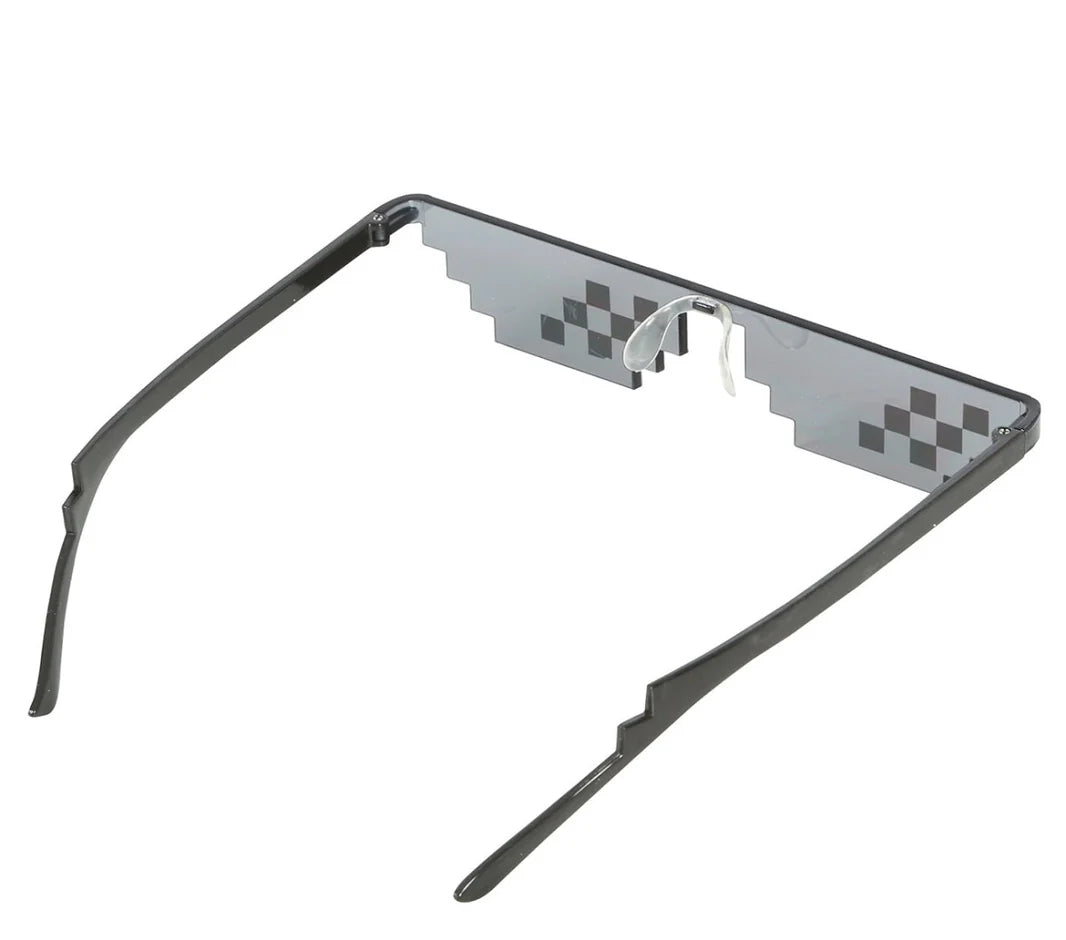 Skapa en lekfull och retroinspirerad look med dessa pixelglasögon. Den kantiga designen i pixelstil ger ett coolt och humoristiskt uttryck som passar perfekt för maskerad, temafester, festivaler eller spelinspirerade outfits. Glasögonen är ett roligt tillbehör som snabbt gör din outfit mer iögonfallande och ger en tydlig gamer- eller meme-inspirerad stil. En rolig accessoar som ger din look en extra dos humor och retrokänsla.