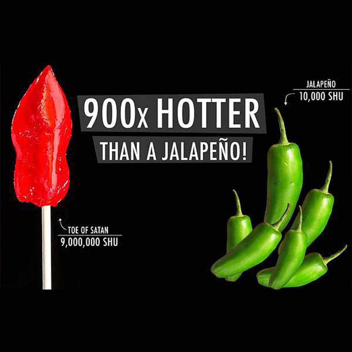 Har du varit sugen att prova på utmaningen Toe of Satan där du ska hålla klubban 5 minuter i munnen? Med en av världens hetaste godisklubbor som med sina 9 miljoner scoville ser till att din mun och svalj får en chili-resa utan dess like då ska du köpa denna godisklubban.