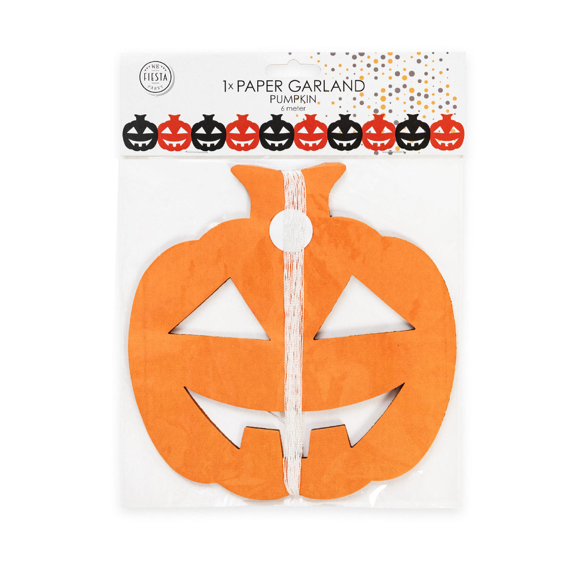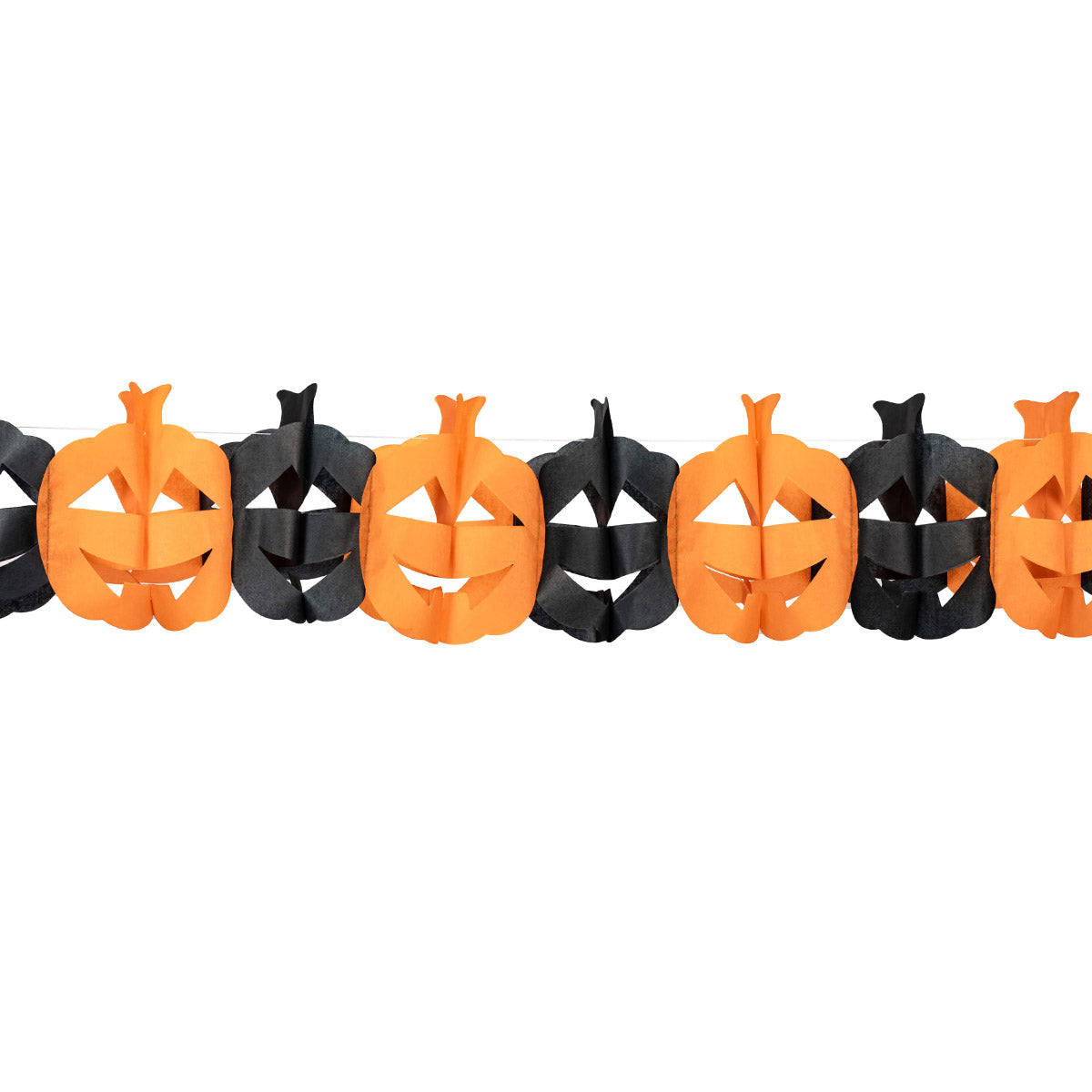 Skapa den perfekta halloweenstämningen med denna pumpagirlang i svart och orange! Med en längd på hela 6 meter är den här pappersgirlangen ett måste för alla halloweenfester. Girlangen består av glada pumpor, vilket ger en klassisk men lekfull känsla till dekorationen. Häng den över ingången, på väggar eller som en mittpunkt i rummet för att skapa en atmosfär som både skrämmer och förtjusar.