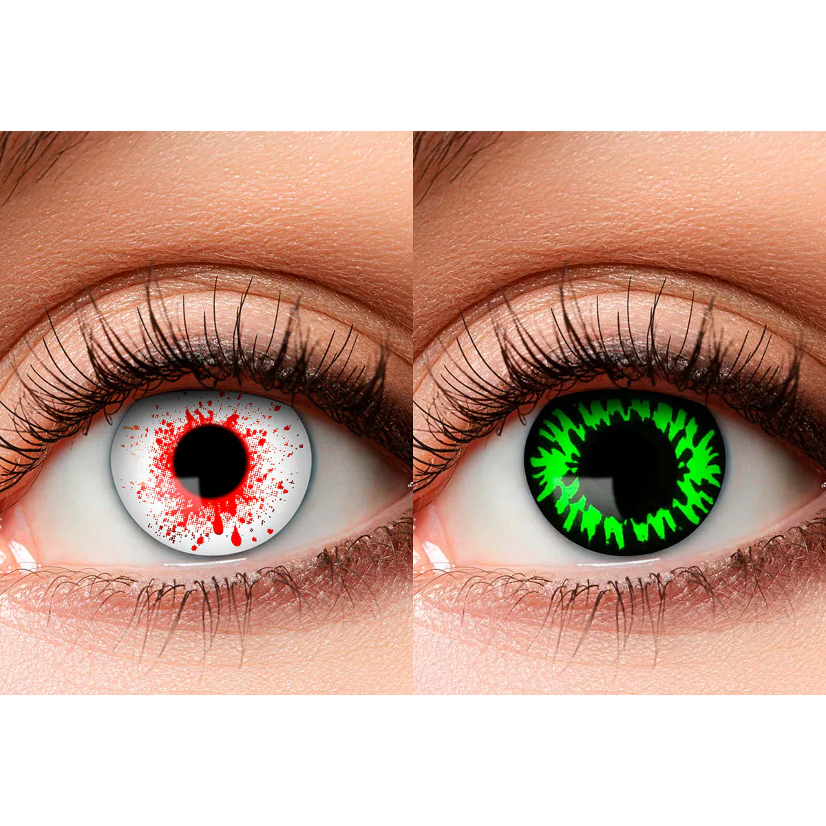 Kliv in i rollen som den ultimata skräckkaraktären med bloody wolf linser som lätt skapar en tvådelad halloweenlook. Dessa linser kommer i ett par med två olika, men lika skräckinjagande designer – en med ett blodigt stänk runt pupillen och den andra med en lysande grön färg som förvandlar dig till en blodtörstig varulv. Denna mix av linser är perfekt för att skapa en unik och skrämmande look som garanterat kommer att få alla på halloweenfesten att rygga tillbaka.