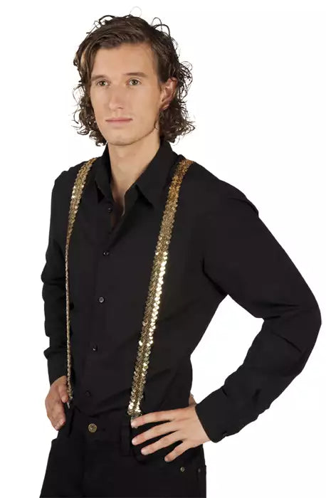 Dessa guldfärgade paljetthängslen är ett perfekt val för dig som vill addera en riktigt lyxig och glittrande touch till din outfit. De skimrande paljetterna reflekterar ljuset på ett effektfullt sätt och ger en elegant men ändå lekfull look – idealiska för scenframträdanden, temafester, nyårsfiranden eller andra festliga tillfällen. Hängslena är justerbara för att passa olika kroppstyper och fästs smidigt med robusta clips i byxlinningen. Kombinera dem med en svart skjorta för maximalt färgkontrast eller matcha med paljettbyxor och kavaj i guld för en komplett showinspirerad outfit.