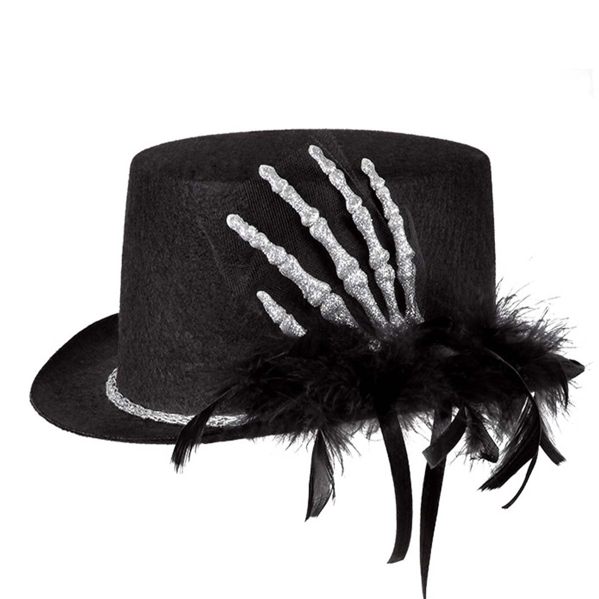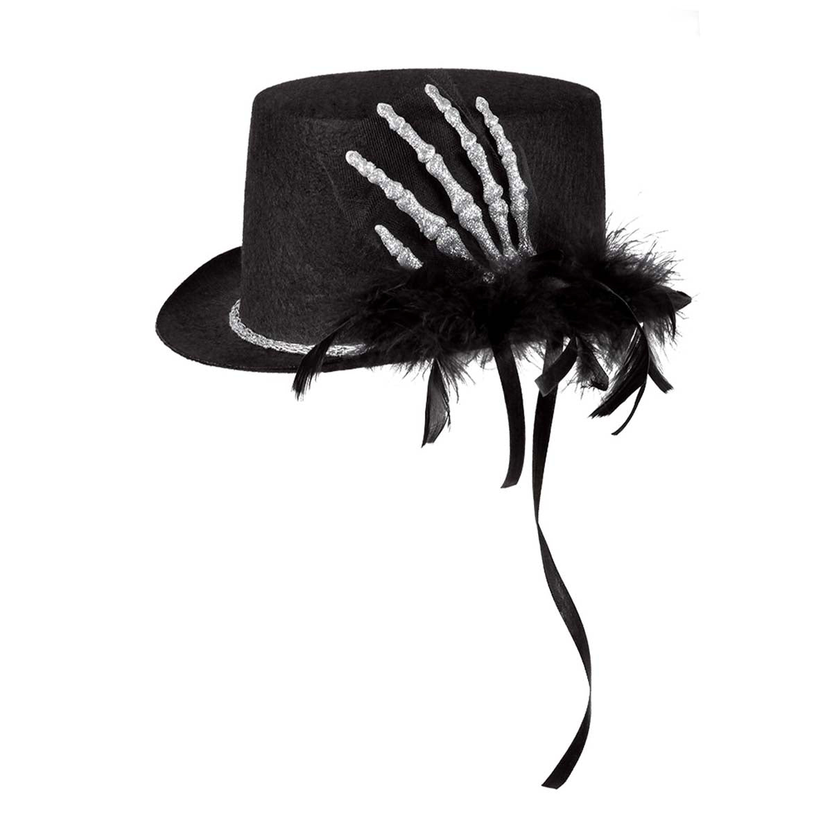 Förvandla din halloweenoutfit till något spektakulärt med denna svarta hatt dekorerad med en glittrande silvrig skeletthand och svarta fluffiga fjädrar. Denna eleganta och mystiska hatt är det perfekta tillbehöret för en kvinnlig voodoo-präst eller för en mer sofistikerad dödgrävarlook på halloweenfesten.