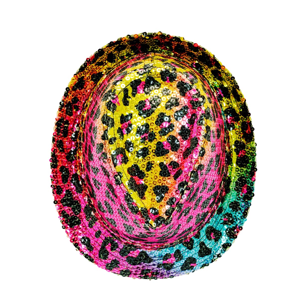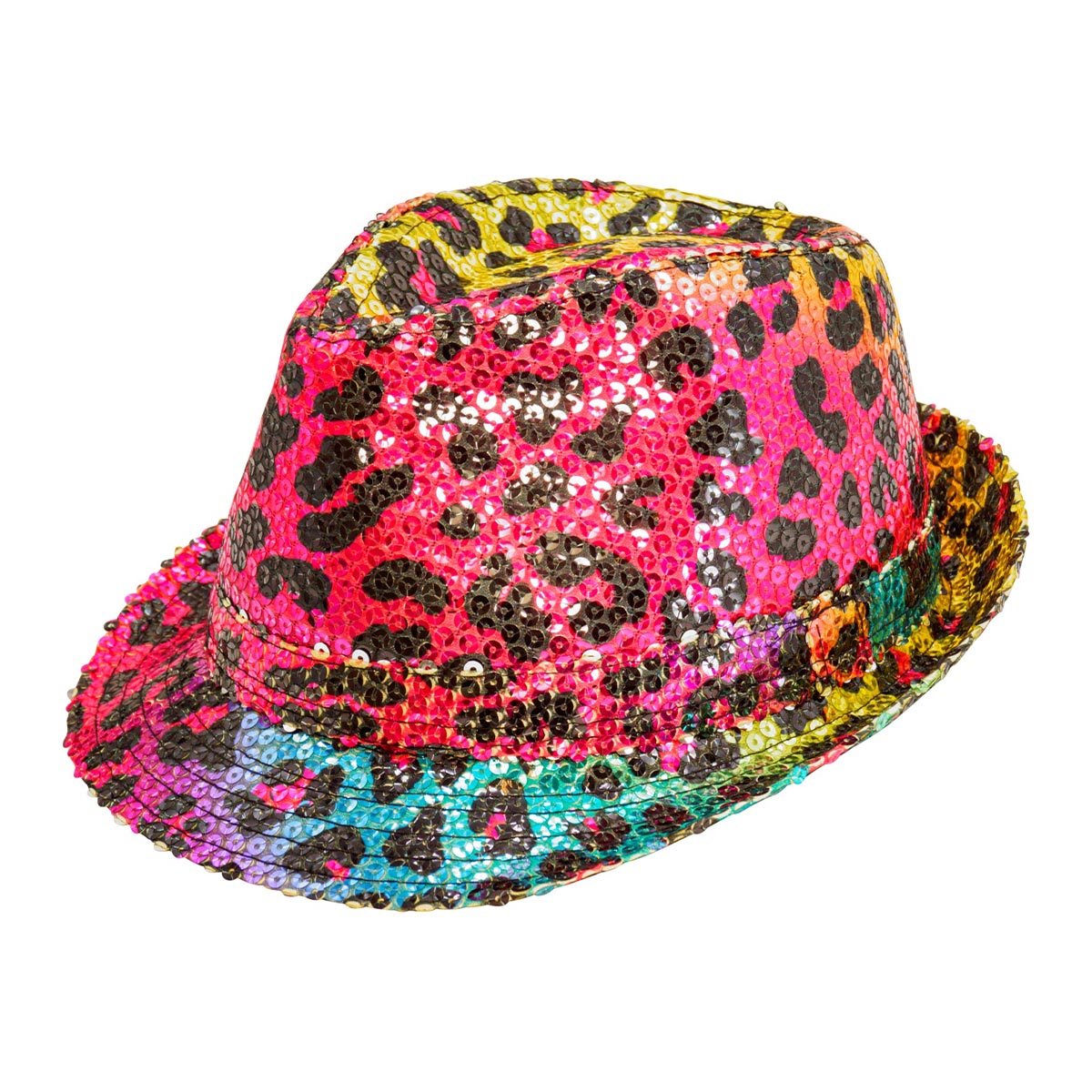 Glittrig hatt med leopardmönster i regnbågsfärger.