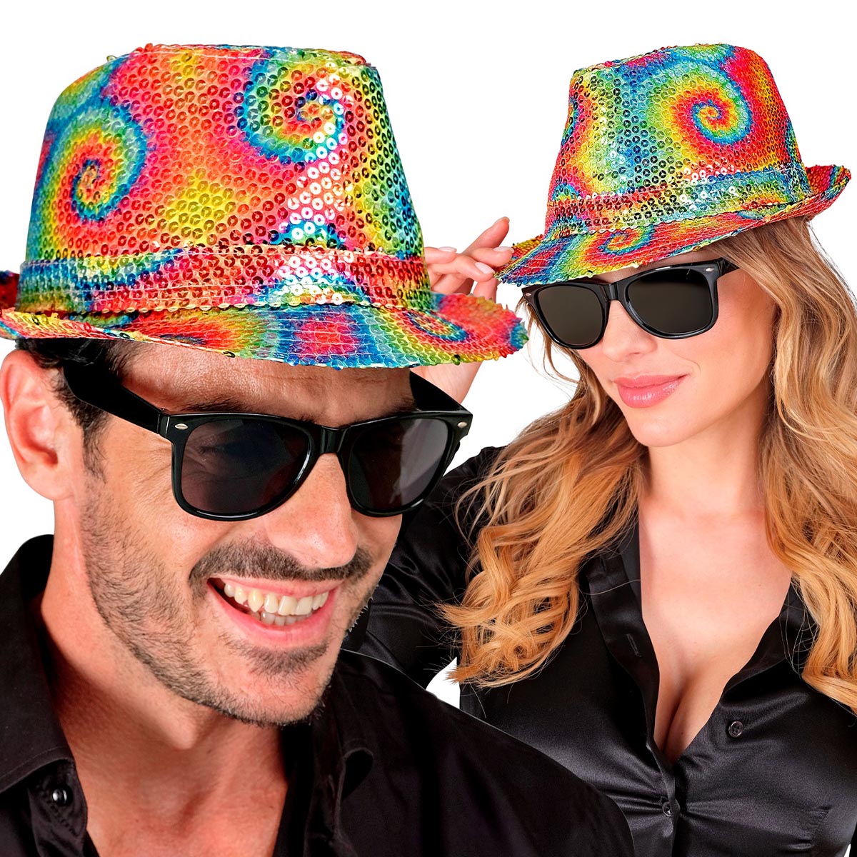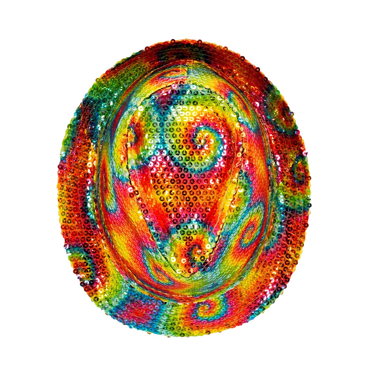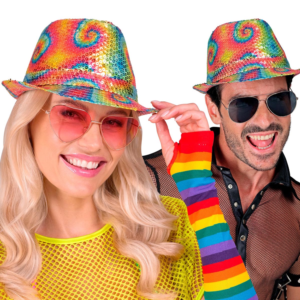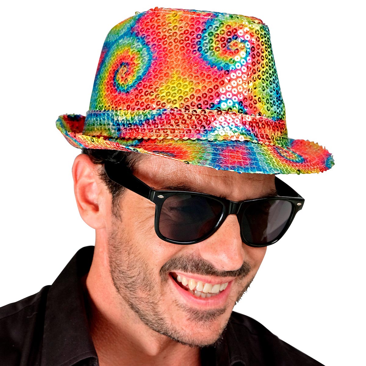 Den här glittriga hatten kombinerar hippie-vibbar med disco-glam på bästa sätt. Med sitt psykedeliska batikmönster i regnbågens alla färger är den det perfekta valet för den som vill sticka ut på festival, maskerad eller en färgstark festkväll.