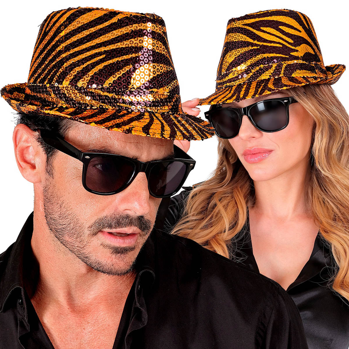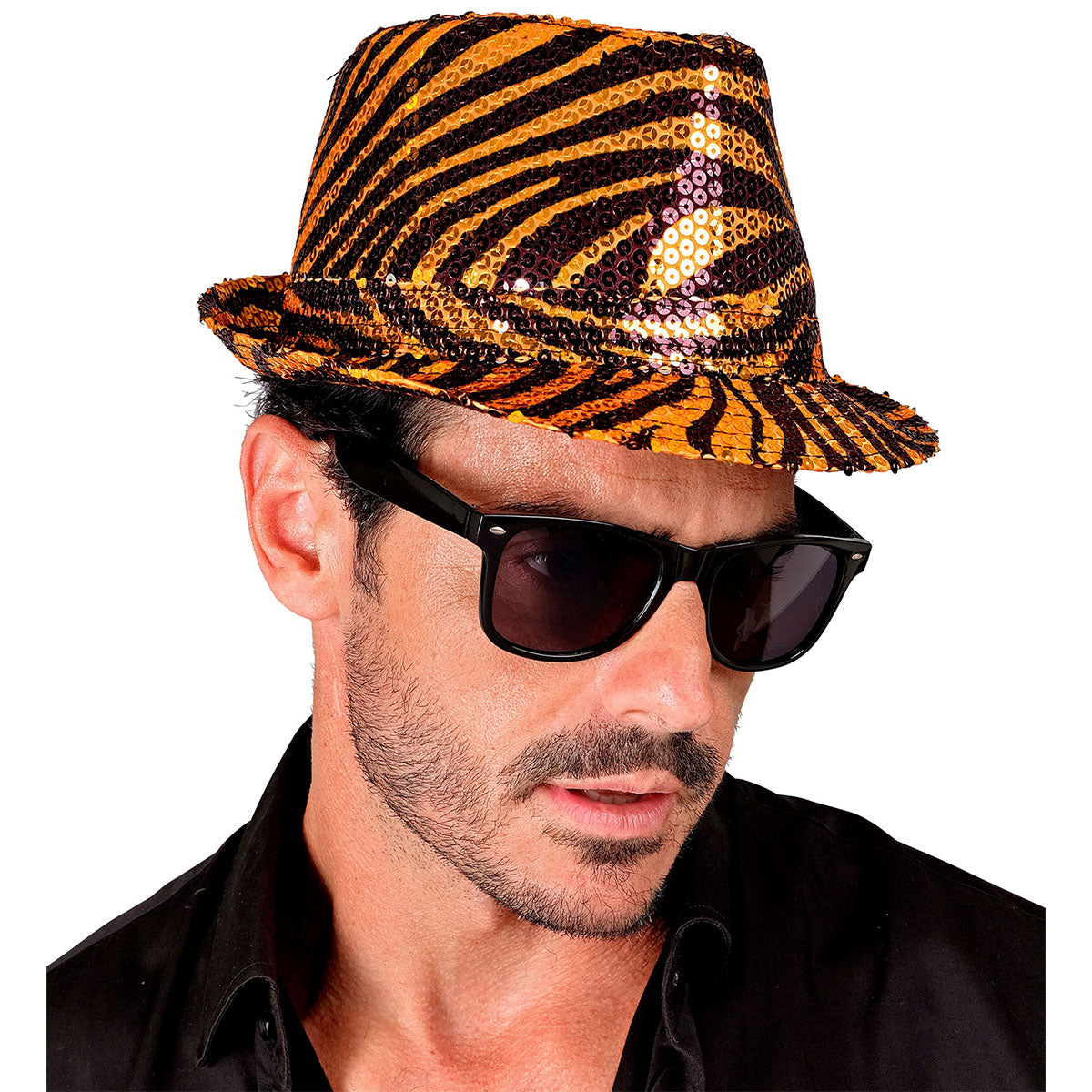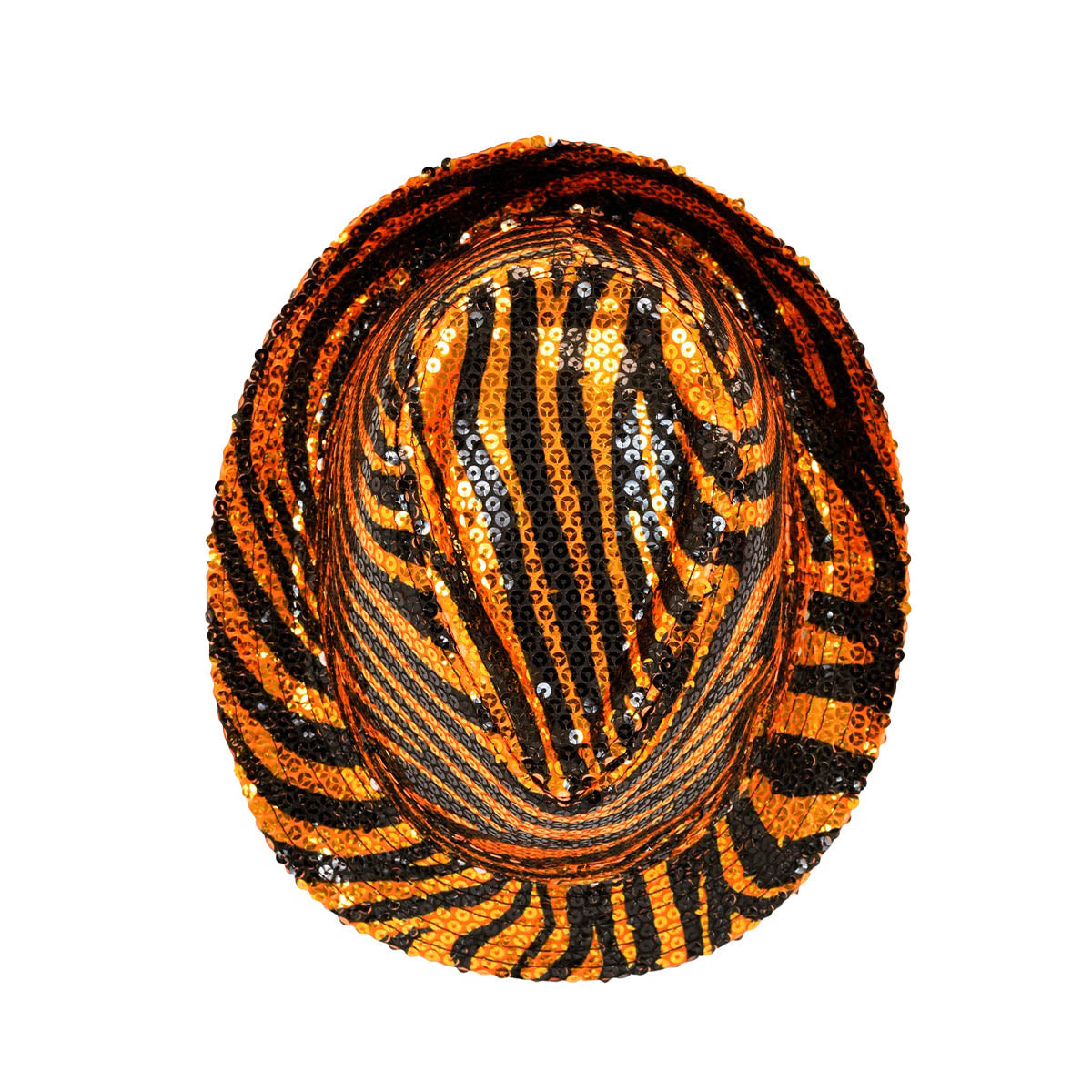 Hatten har en djärv tigerdesign i orange och svart, täckt med glänsande paljetter som fångar ljuset från alla vinklar. Den klassiska fedora-formen ger en cool och stilfull touch, och den lätta passformen gör den bekväm att bära hela kvällen.