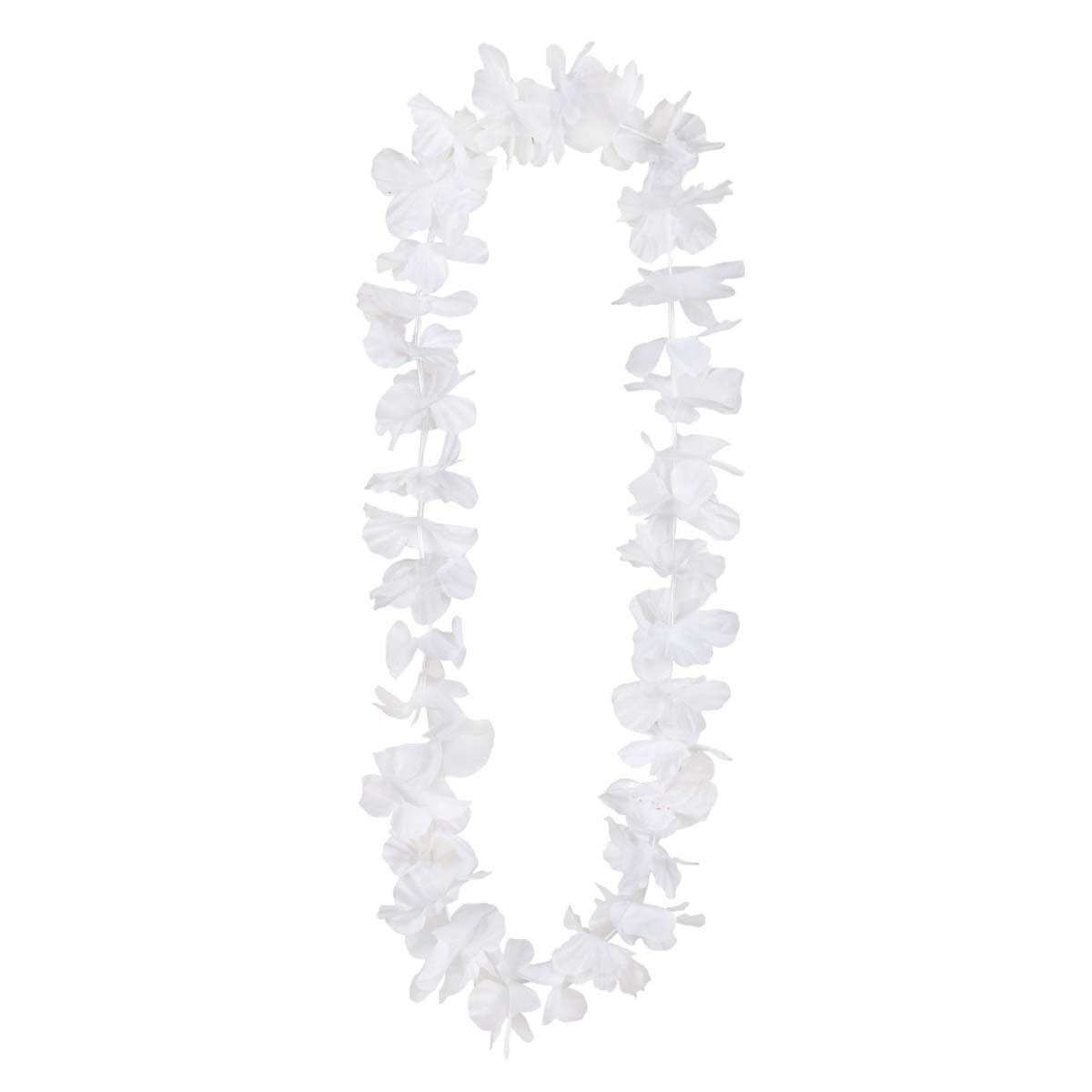 Ta på dig själv en vit hawaii-blomsterkrans! Ett utmärkt tillbehör till hawaiifesten eller andra teman som kräver en vit hawaiikrans. Vita tyger lyser ofta upp av UV-lampor så varför inte ta en hawaiikrans som kan skina upp starkt i ljuset på neonfesten.