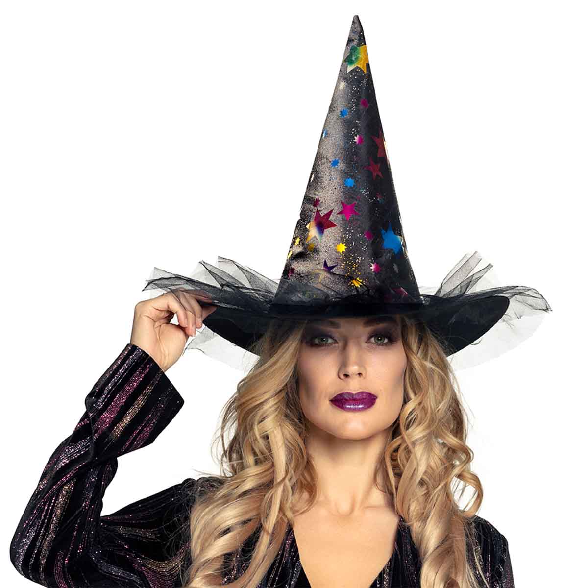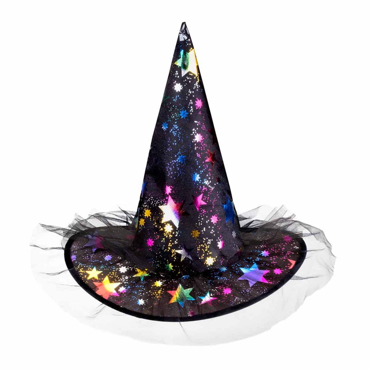 Var en lite piffigare häxa med en häxhatt med färgfulla stjärnor och tyll.