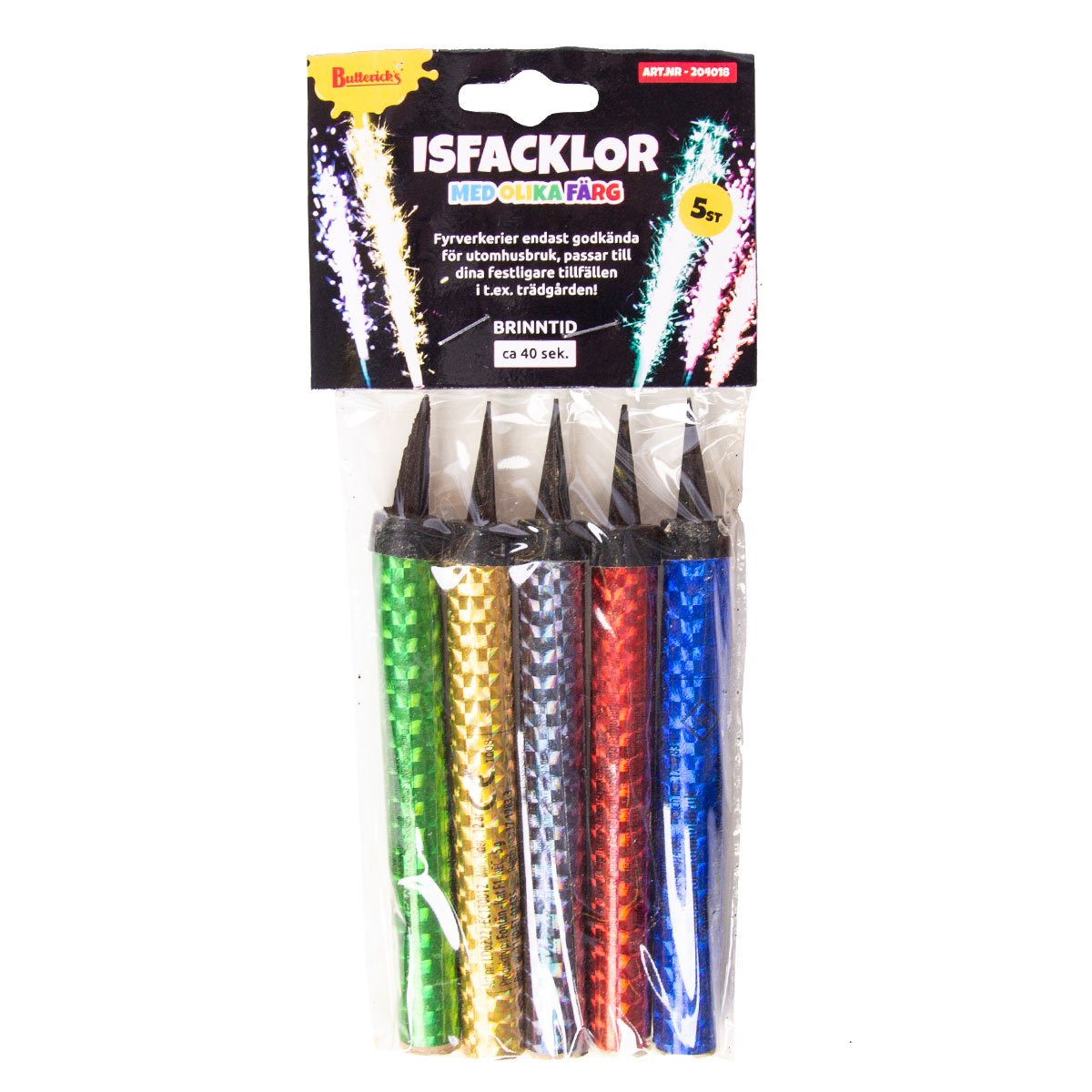Klassiska isfacklor i ny tappning. Elden som sprutar blir i samma färg som isfacklan, i varje förpackning finner du en fackla av respektive färg.