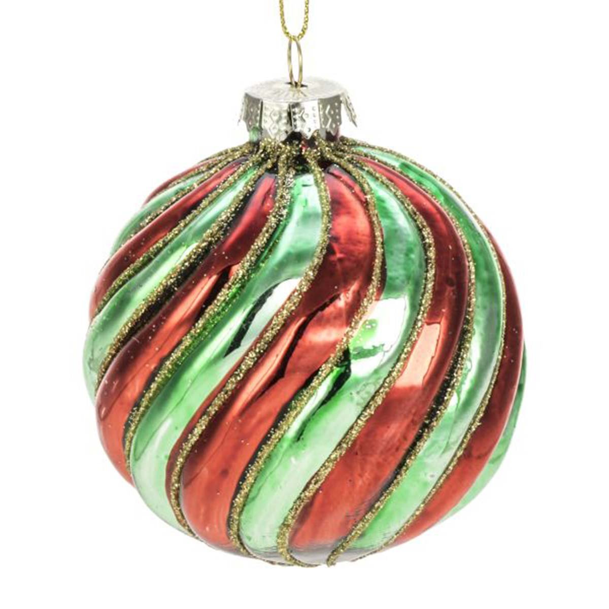 Dekorera upp julgranen med en riktigt julig julgranskula i julens härligaste färger, rött, grönt och guld. De guldiga detaljerna är i glitter och påminner om julgransglitter tillsammans med de härliga grön/röda färgerna som skriker jul. Denna randiga julgranskula är av glas och skimrar extra fint i julgranens belysning.