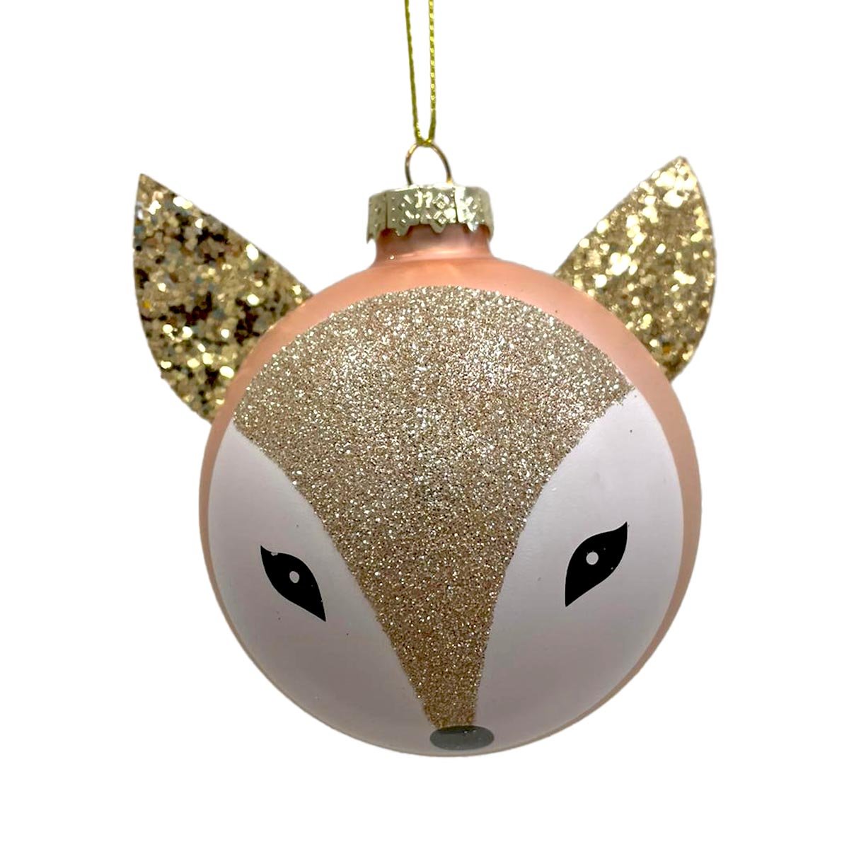 Denna 8 cm breda julgranskula i rosé och guld har ett målat ansikte från en räv och fina guldiga öron fästa upptill på julkulan. Riktigt fin julgranskula som du kan hänga i din julgran eller ge i present till någon du tycker om. Alla kommer bli glada av denna superfina julgranskula.