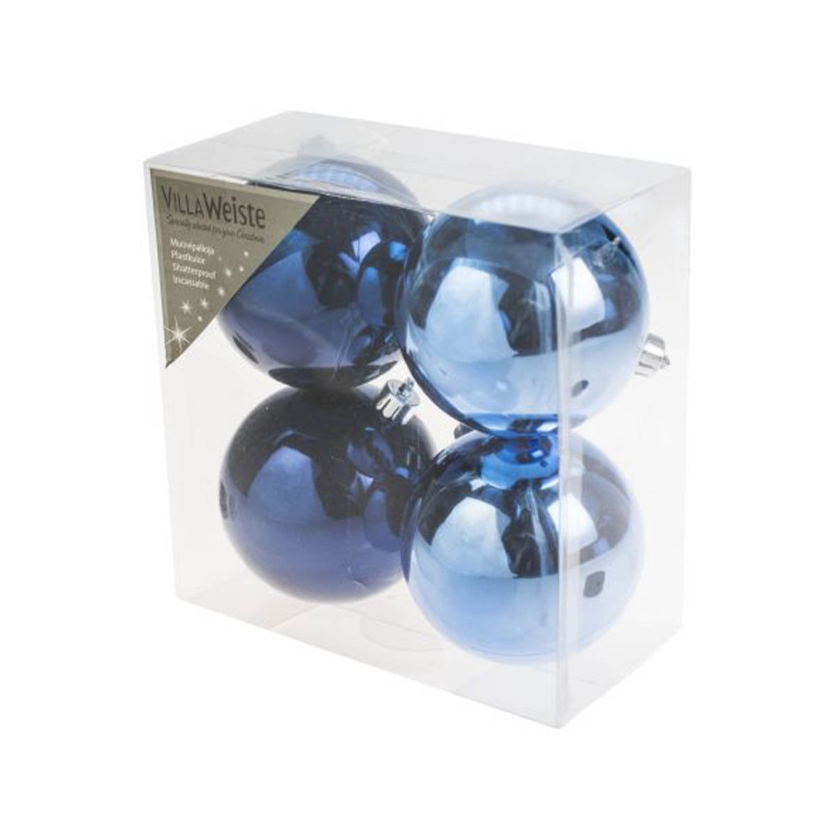 Denna förpackningen innehåller fyra blå blanka julkulor i plast som påminner om glas.