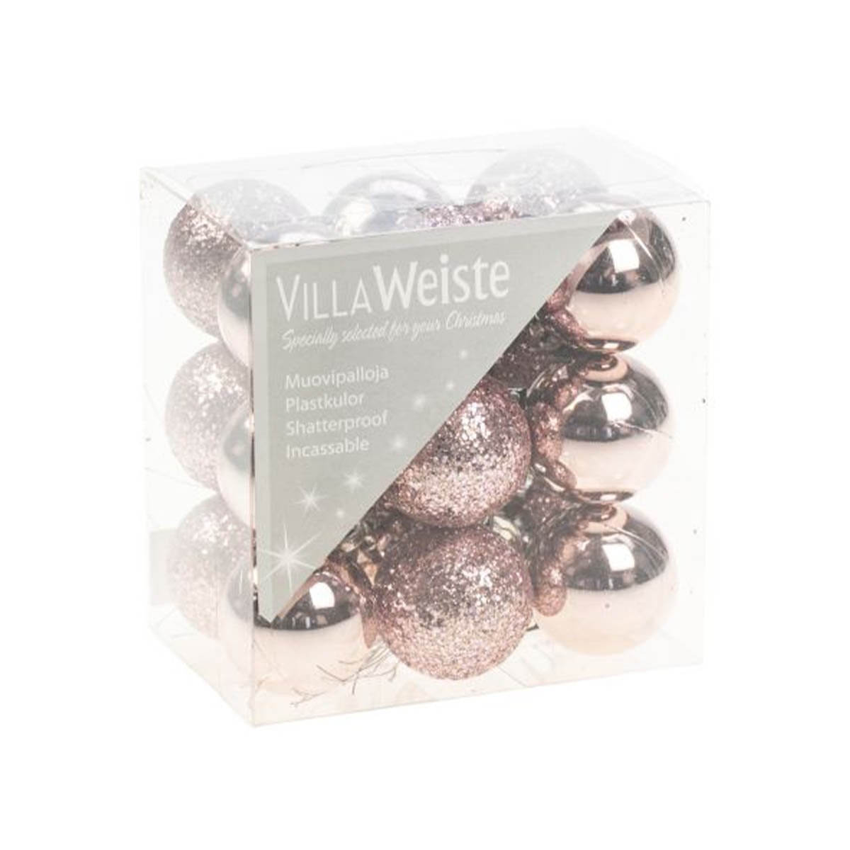 Förpackningen innehåller nio glittriga och nio blanka julgranskulor i rosa.