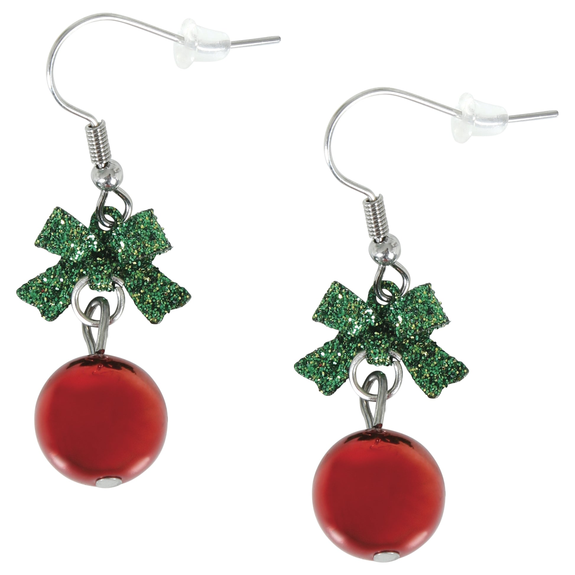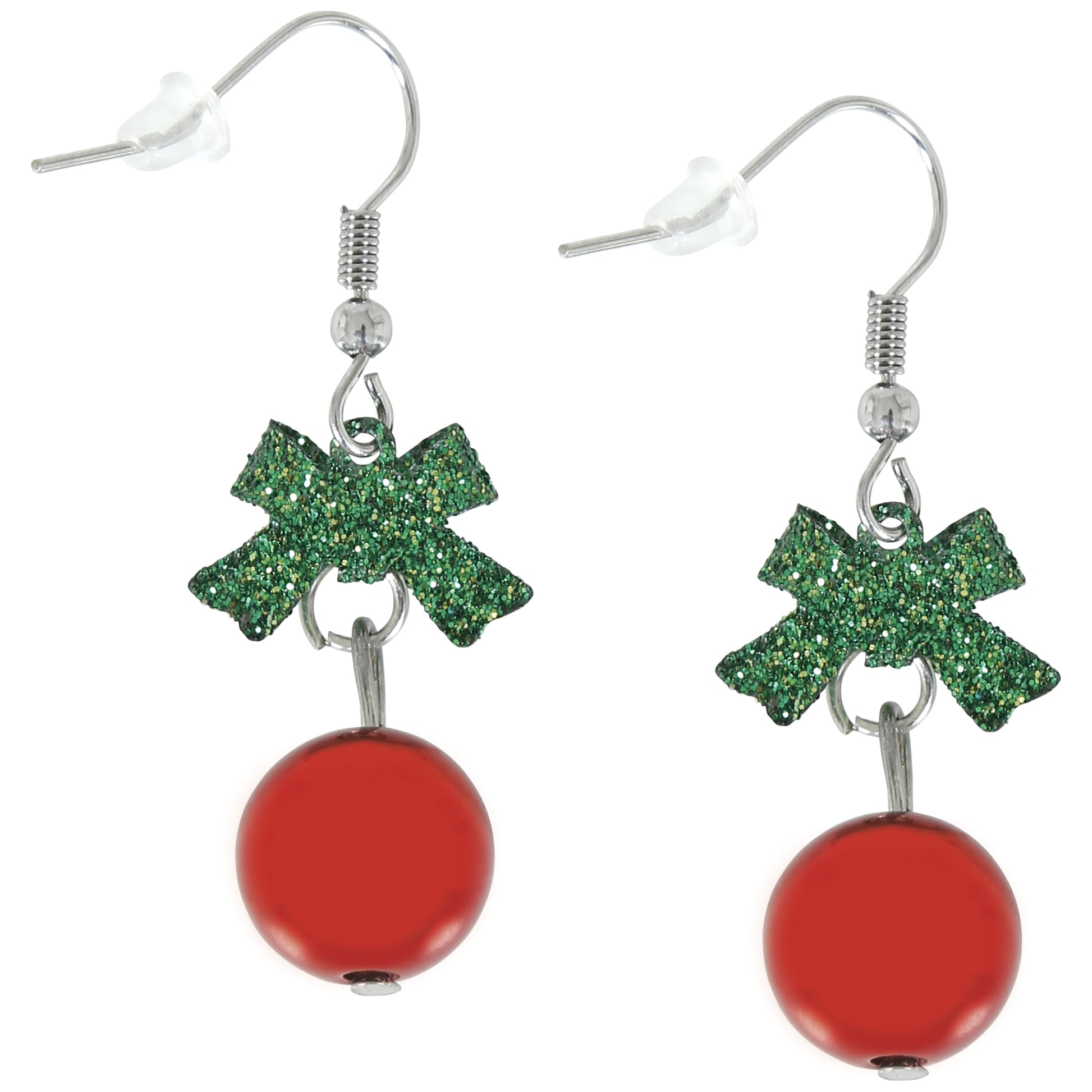 Dessa stilfulla julörhängen kombinerar två klassiska juldetaljer: en gnistrande grön rosett och en klarröd julkula. Den glittriga rosetten fångar ljuset på ett härligt sätt, medan den röda kulan hänger nedanför och skapar ett lekfullt, elegant helhetsintryck.