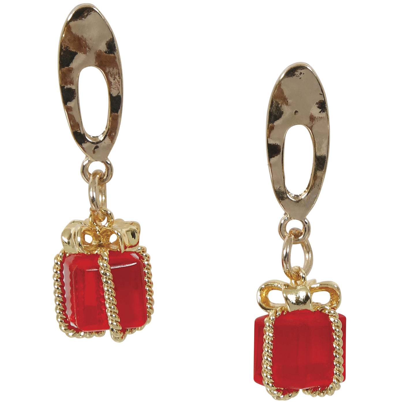 Stråla lite extra i jul med dessa festliga örhängen formade som små röda presentpaket! Varje örhänge pryds av ett rött kubformat paket dekorerat med gyllene band och en söt liten rosett på toppen. Paketen hänger från en elegant, avlång guldfärgad fästdel med blank finish, vilket ger örhängena en fin balans mellan lekfullt juligt och stilfullt festligt.