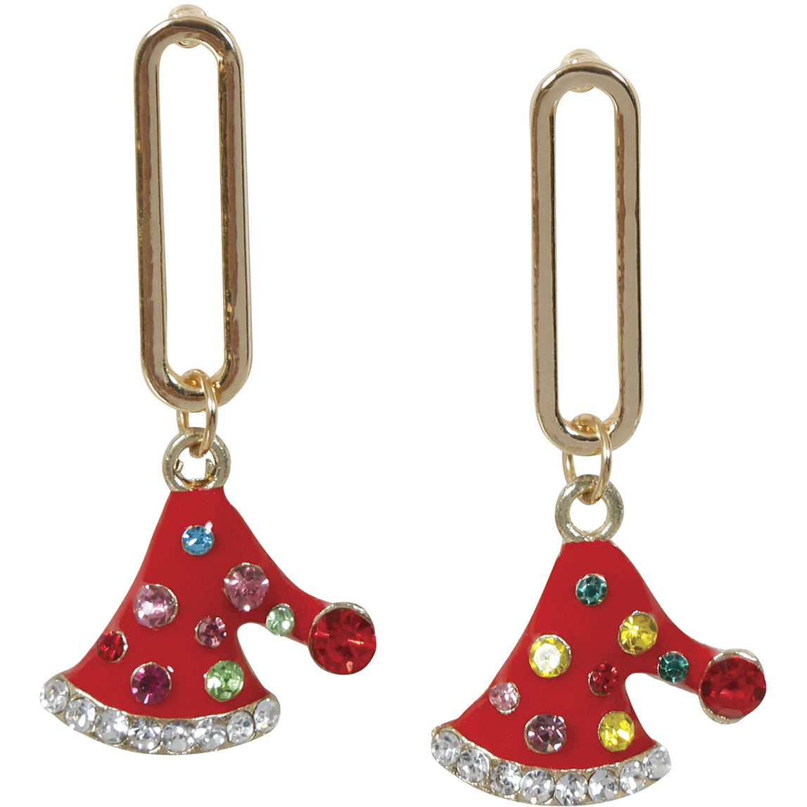 Låt julglittret följa med dig vart du än går! Dessa härliga julörhängen har röda tomteluvor dekorerade med färgstarka strasstenar i flera nyanser. Luvans kant och tofs glittrar extra tack vare en rad klara stenar som fångar ljuset vackert. De hänger från avlånga guldfärgade länkar som ger örhängena en modern och trendig känsla.