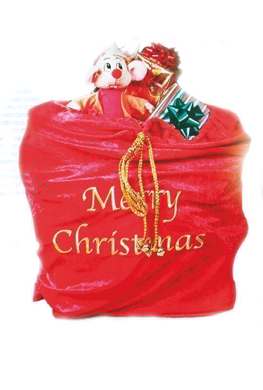 En röd ändamålsenlig tomtesäck med texten "Merry Christmas" i guldbrodyr. Lägg dina julklappar i denna snygga julklappssäck för att ge julklapparna den fina inramning de förtjänar. Med denna säck är det lättare för tomten att transportera julklapprna till mottagarna.