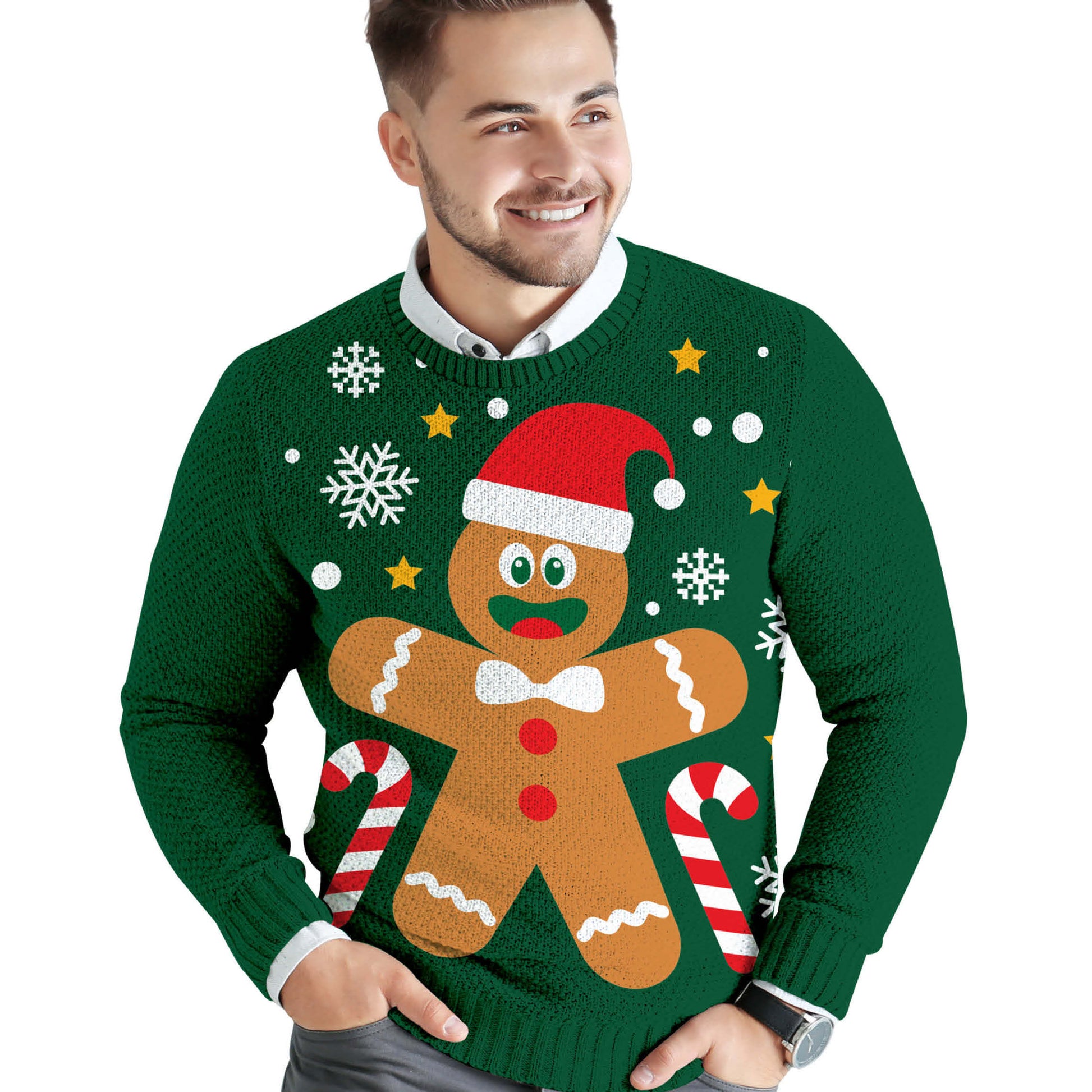 Gör dig redo för december månads alla festligheter med en jultröja som verkligen fångar blickarna! Den här gröna, mysigt stickade tröjan kombinerar klassisk julkänsla med en lekfull, modern design. Mitt på bröstet sitter en glad pepparkaksgubbe med stor tomteluva, vit fluga och röda knappar, illustrerad i en färgstark och detaljerad stil som ger tröjan en varm och humoristisk karaktär.