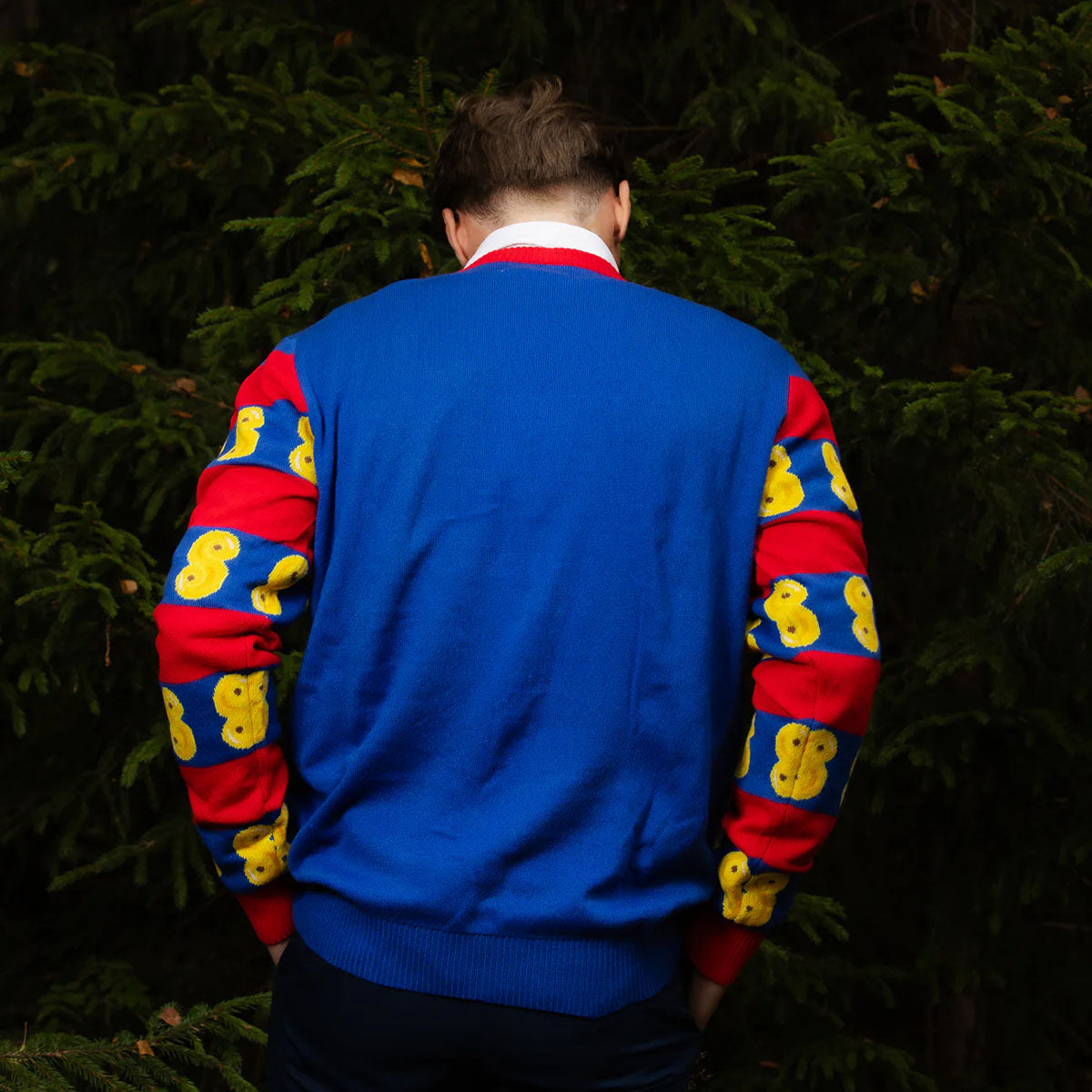 Sprid julstämning och humor med denna festliga jultröja inspirerad av den älskade lussekatten! Perfekt för luciafirandet eller julfesten, denna tröja är inte bara bekväm utan också en härlig konversationsstartare. Med den stora gula lussekatten på framsidan och texten "Lussebulle" tryckt i samma klara gula färg blir du garanterat kvällens glädjespridare. De röda och blåa ärmarna pryds av små lussekattsmotiv som ger en extra touch av svensk julkänsla.