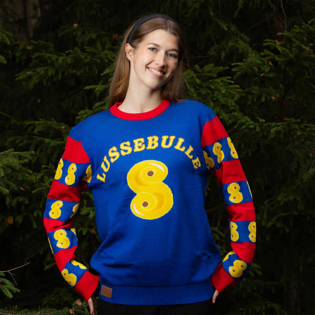 Sprid julstämning och humor med denna festliga jultröja inspirerad av den älskade lussekatten! Perfekt för luciafirandet eller julfesten, denna tröja är inte bara bekväm utan också en härlig konversationsstartare. Med den stora gula lussekatten på framsidan och texten "Lussebulle" tryckt i samma klara gula färg blir du garanterat kvällens glädjespridare. De röda och blåa ärmarna pryds av små lussekattsmotiv som ger en extra touch av svensk julkänsla.