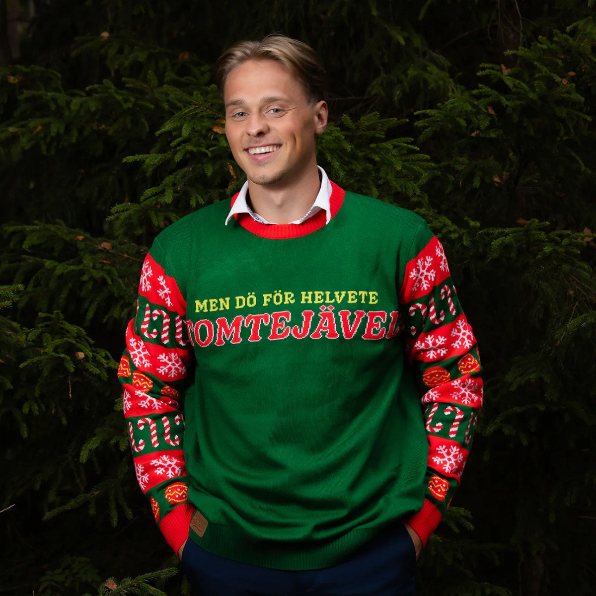 Ge din julklädsel en dos humor och attityd med den ultimata jultomten på dåligt humör-tröjan! Vår gröna jultröja med den klassiska texten "Men dö för helvete, TOMTEJÄVEL" fångar all stress och frustration som ibland kan höra julen till. Perfekt för dig som älskar humor och att sticka ut vid julens alla festligheter! Tröjan har även en unik design på baksidan med en ikonisk illustration av tomten som får ett välriktat slag – en blinkning till julfilmen och hur vi alla kanske känner oss under hektiska julveckor.