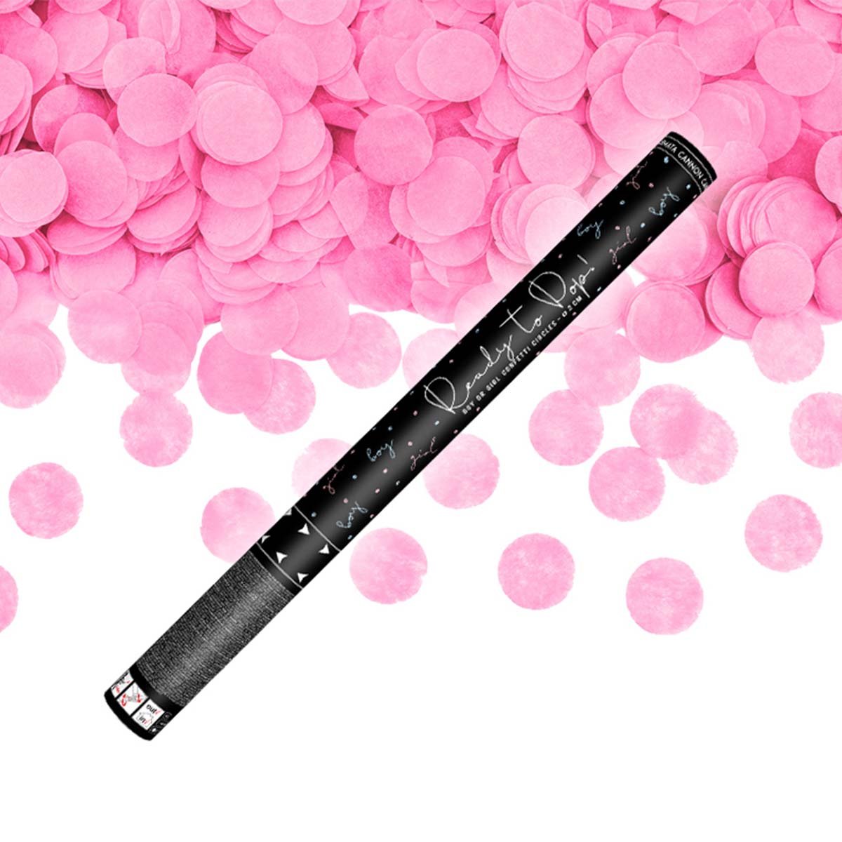 Skjut ut ett härligt ljusrosa papperskonfettiregn över gästerna på erat gender reveal party, denna konfettikanonen har både "boy" och "girl" skrivet på sig och det är först när man skjuter av den som man får veta vad innehållet avslöjar.