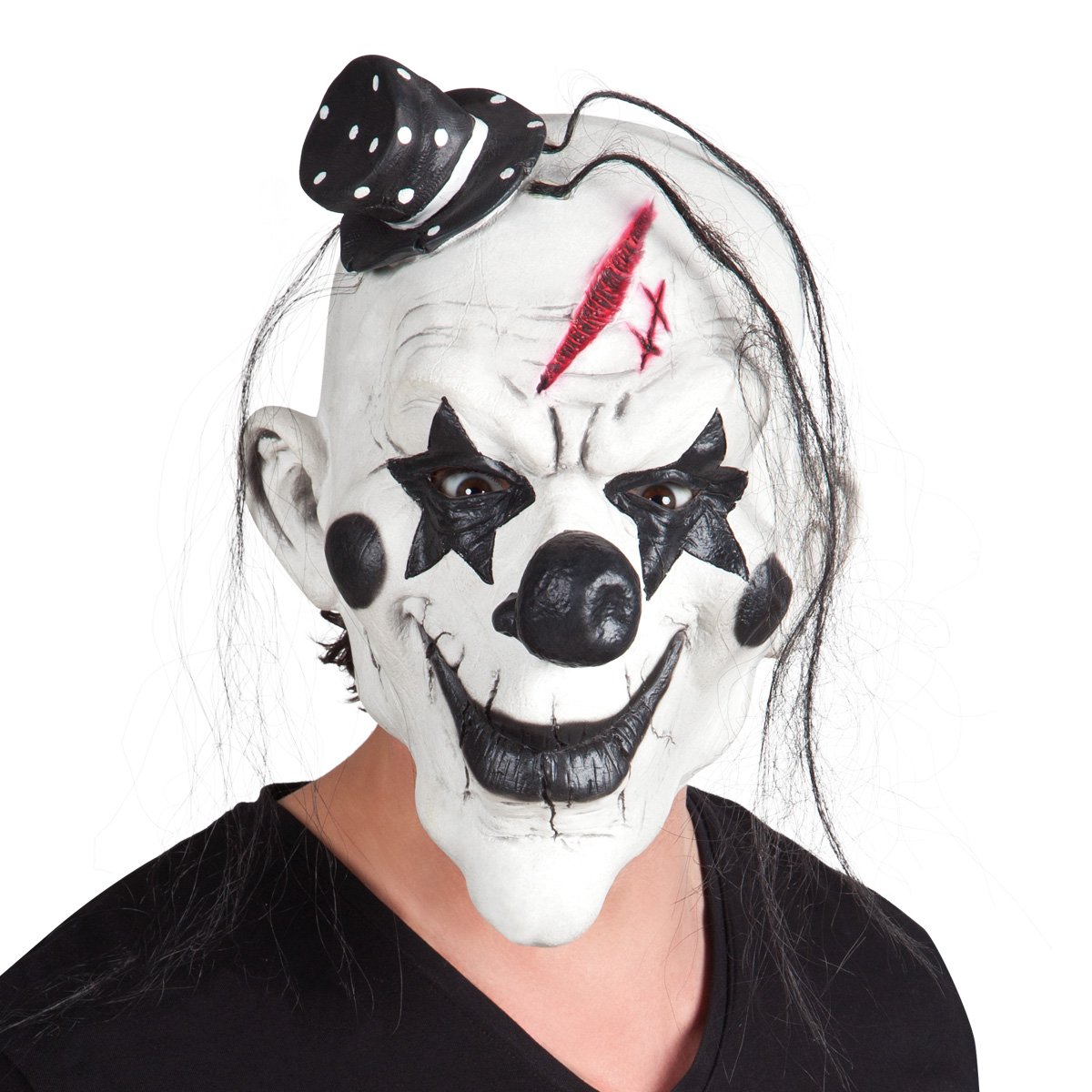 Glöm glada cirkusclowner – den här masken är hämtad direkt från dina mardrömmar! Med en grimaserande mun, svarta stjärnögon, skräckinjagande ärr och en tilltufsad minihatt är denna killer clown redo att sprida panik på Halloweenfesten.