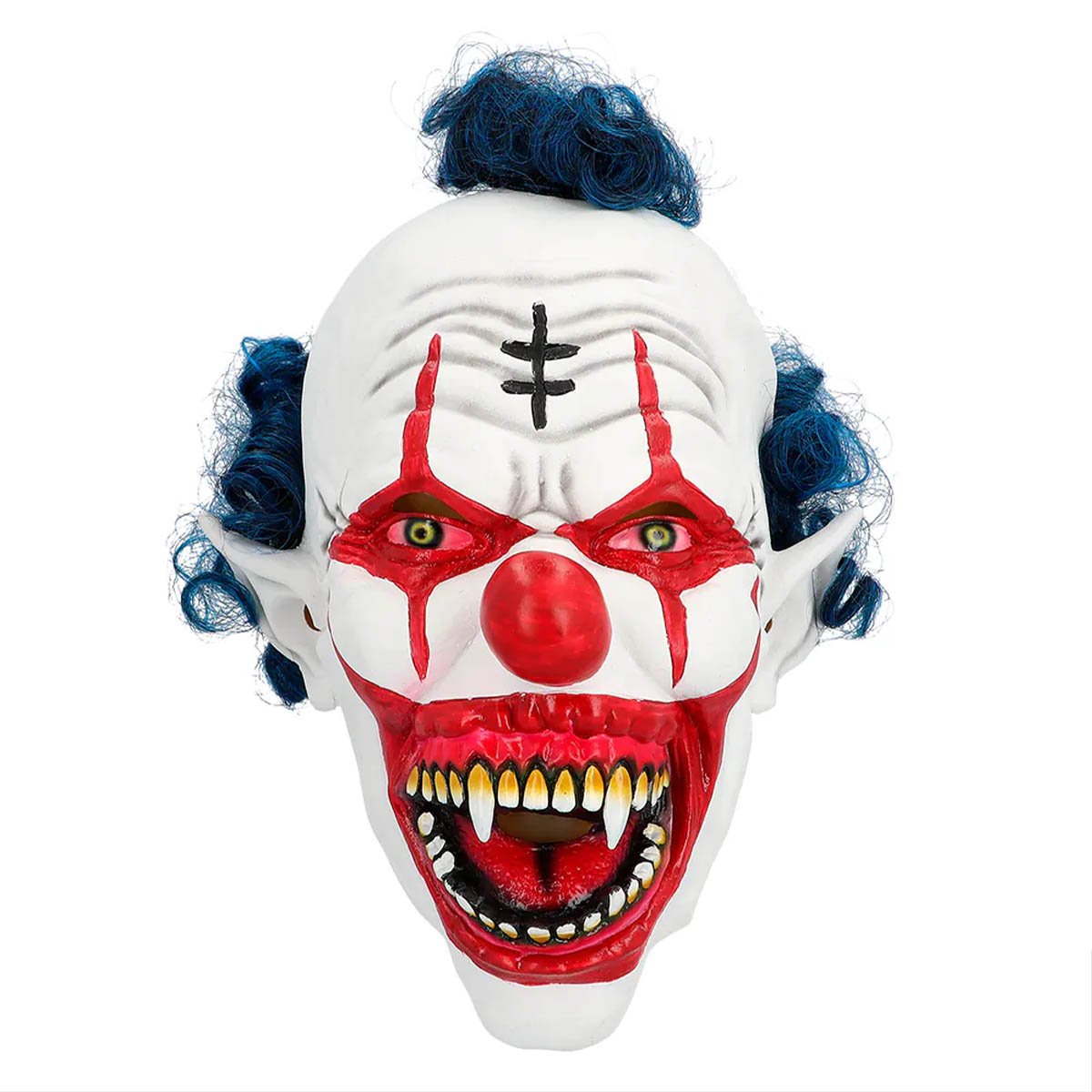 Förbered dig på att chocka och skrämma alla med denna vampire clown-latexmask! Med en kuslig blandning av clownens otäcka leende och vampyrens vassa huggtänder blir denna mask ett självklart val för den som vill sätta skräck på festen. De röda och vita ansiktsdetaljerna tillsammans med den karakteristiska clownnäsan och de vilt blåa håret gör masken både obehaglig och fascinerande. Perfekt för halloween eller andra tillfällen där du vill sticka ut med en oförglömlig utklädnad.