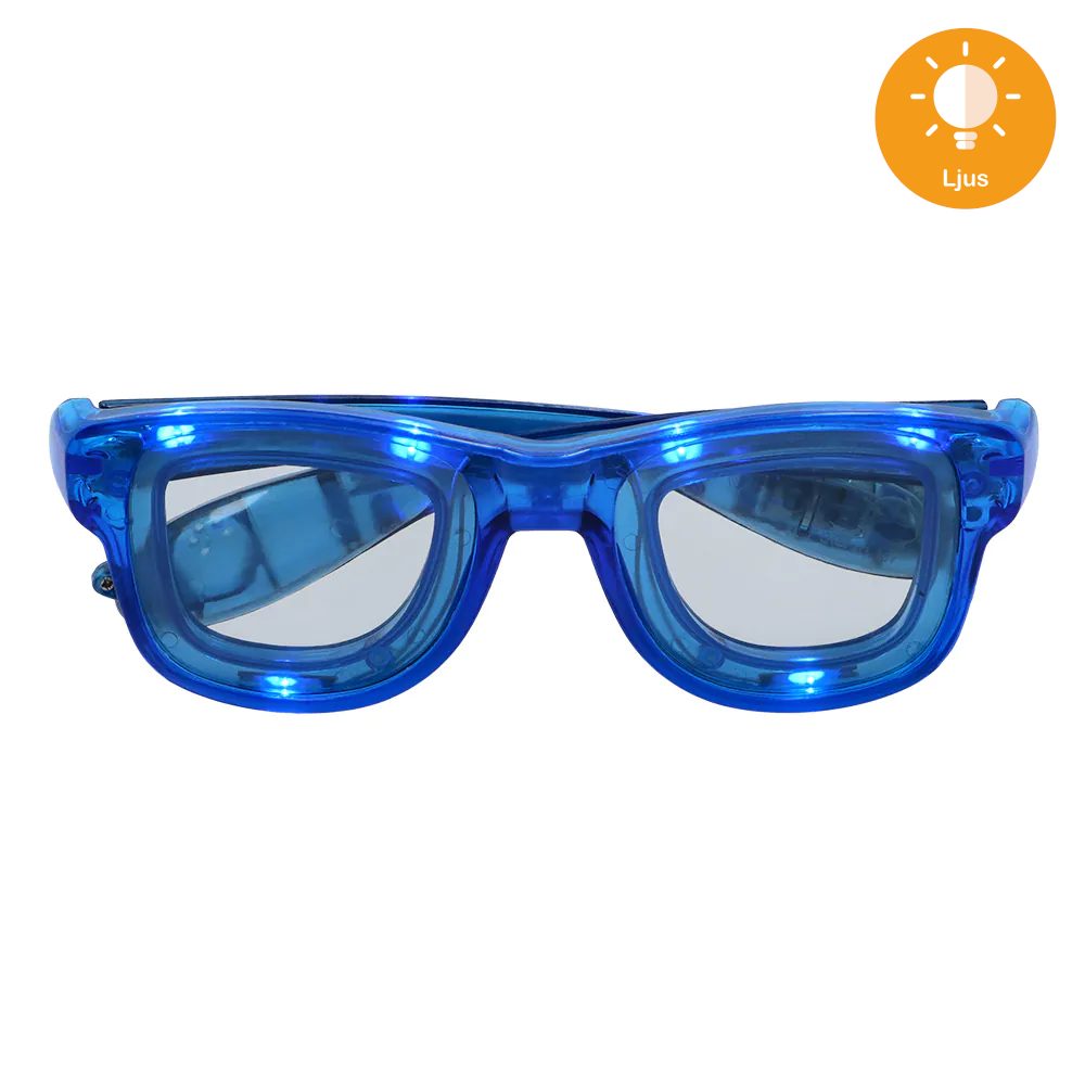 Coola LED-glasögon i klar blå färg som lyser upp och ger en riktigt futuristisk look! Glasögonen har en lysande ram som sprider ett starkt blå sken runt hela glasögonen. Designen är modern och stilren, med en solid plastbåge och tonade linser som ger en effektfull kontrast mot det lysande ljuset.
