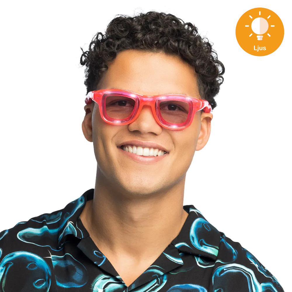 Coola LED-glasögon i klar rosa färg som lyser upp och ger en riktigt futuristisk look! Glasögonen har en lysande ram som sprider ett starkt rosa sken runt hela glasögonen. Designen är modern och stilren, med en solid plastbåge och tonade linser som ger en effektfull kontrast mot det lysande ljuset.
