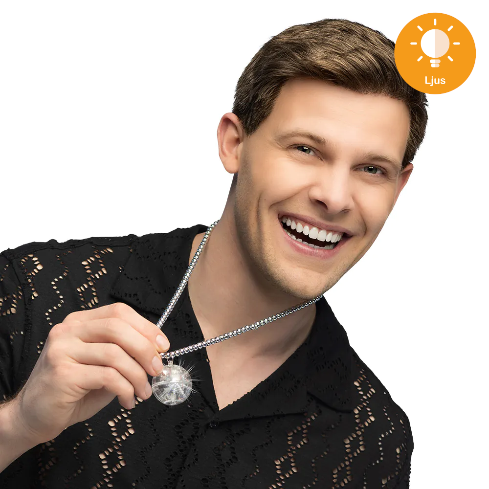 Stilfullt LED-halsband med en klar, rund discokula som lyser upp och sprider ett glittrande sken! Den genomskinliga kulan fångar ljuset och reflekterar det på ett sätt som påminner om en liten discokula – perfekt för att skapa en festlig och iögonfallande effekt. Halsbandet har en tunn, bekväm kedja i plast som gör det lätt att bära hela kvällen.