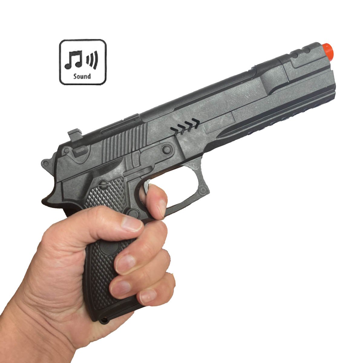 Det orangefärgade munstycket säkerställer att pistolen tydligt syns som en leksak, vilket är viktigt för säkerheten under maskerader och andra evenemang. Dessutom avger den ett flerskottsljud när avtryckaren trycks in, vilket förhöjer din karaktärs trovärdighet på festen.