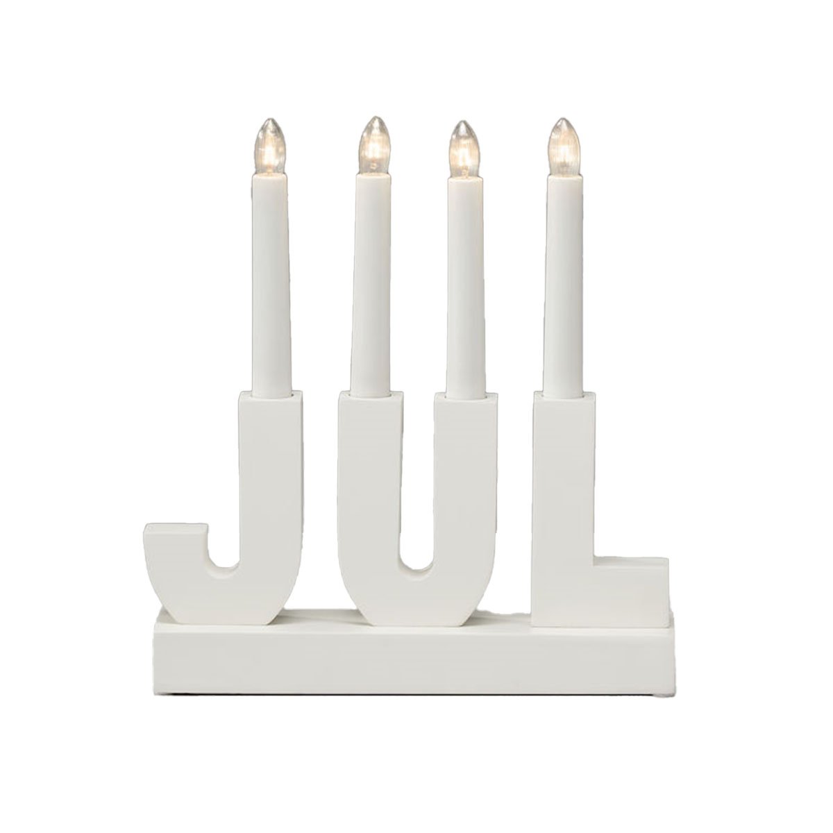 Dekorera hemmet med en vit ljusstake formad till JUL och med LED-lampor upptill så får du en härlig julstämning i decembermörkret.