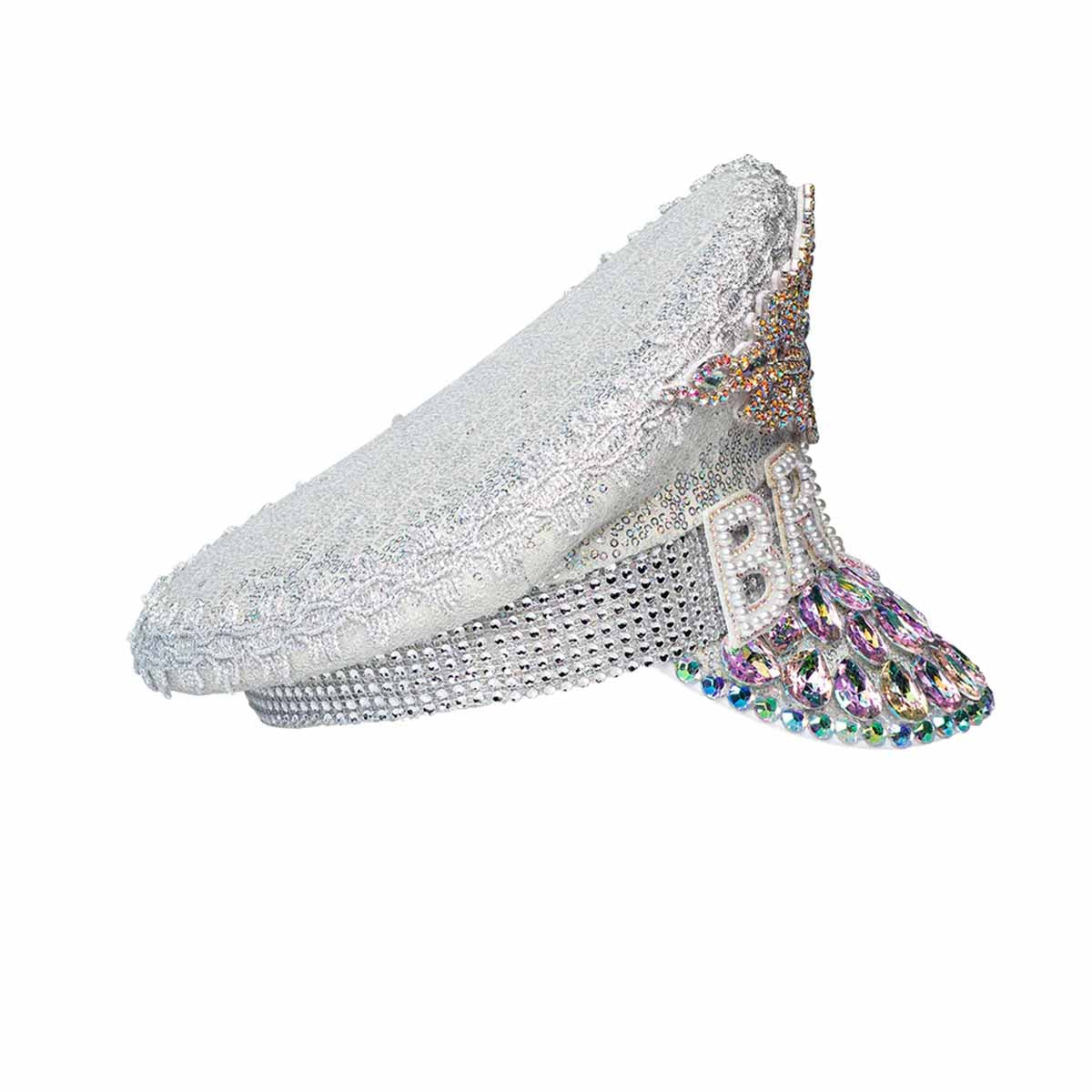 Runt "BRIDE"-texten och över kepsens krona finns en överdådig dekoration av olika kristaller och paljetter i regnbågens alla färger. Dessa skapar ett hänförande mönster som får kepsen att skimra och skina från alla vinklar. Den unika designen kombinerar elegans med en touch av festlig extravagans