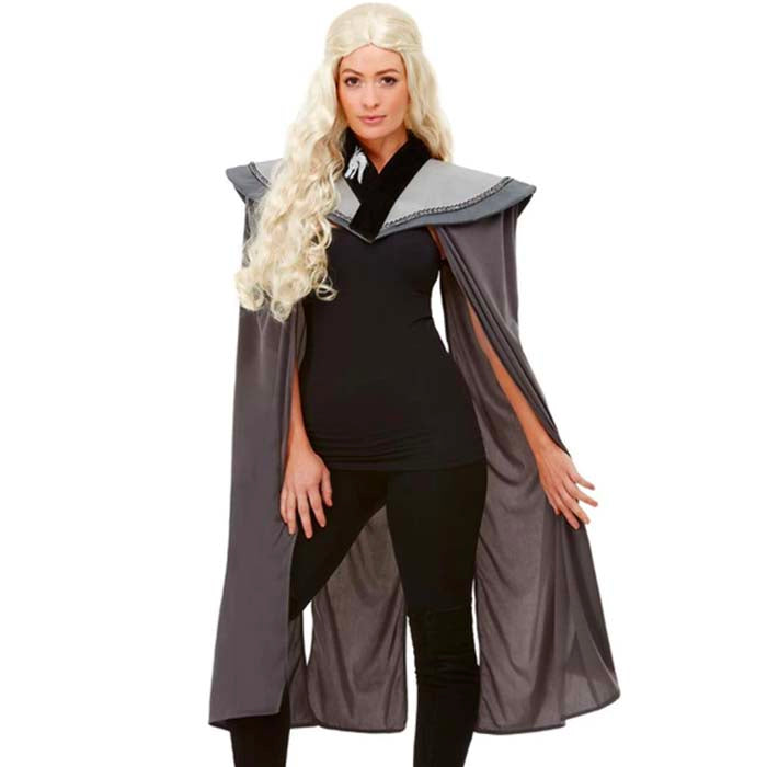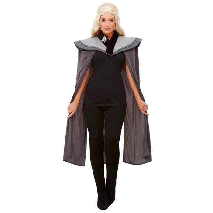 Cape med slitsar och stor krage. Passar perfekt till medeltidskrigaren eller sagotemat. Manteln har en drake tryckt på kragen och passar därför perfekt till drakprinsessan.