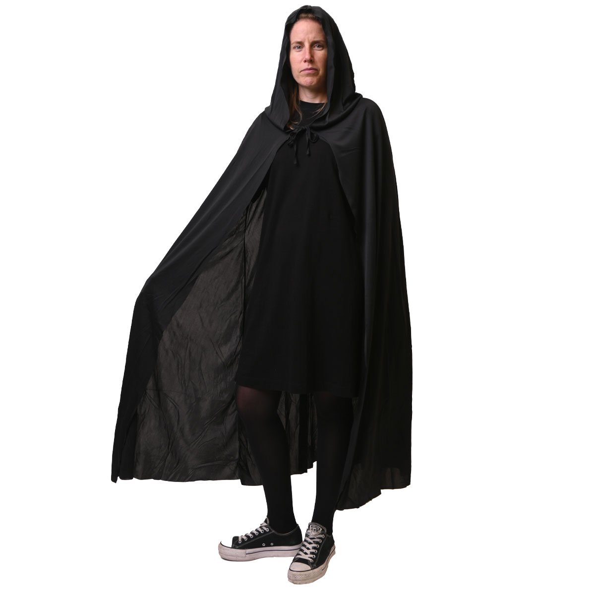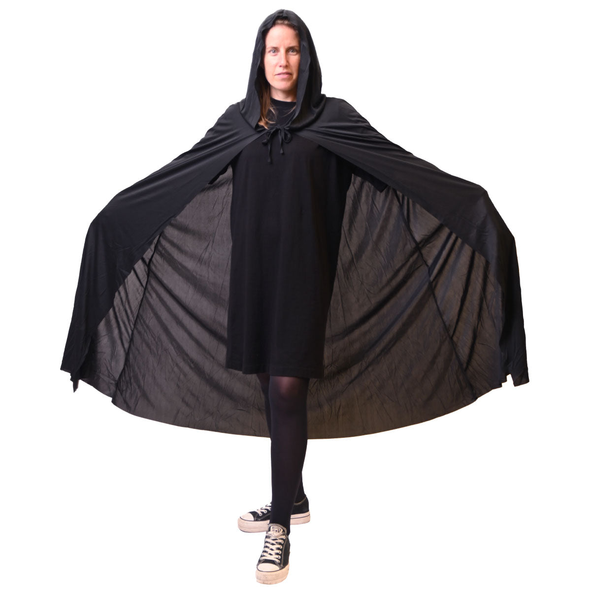 Denna eleganta, svarta cape med huva är det ultimata tillbehöret för att skapa en atmosfär av mystik och intriger vid din nästa halloween- eller maskeradfest. Designad i vuxenstorlek och med praktiska band för att knyta fast den runt halsen, är denna cape både snygg och funktionell.