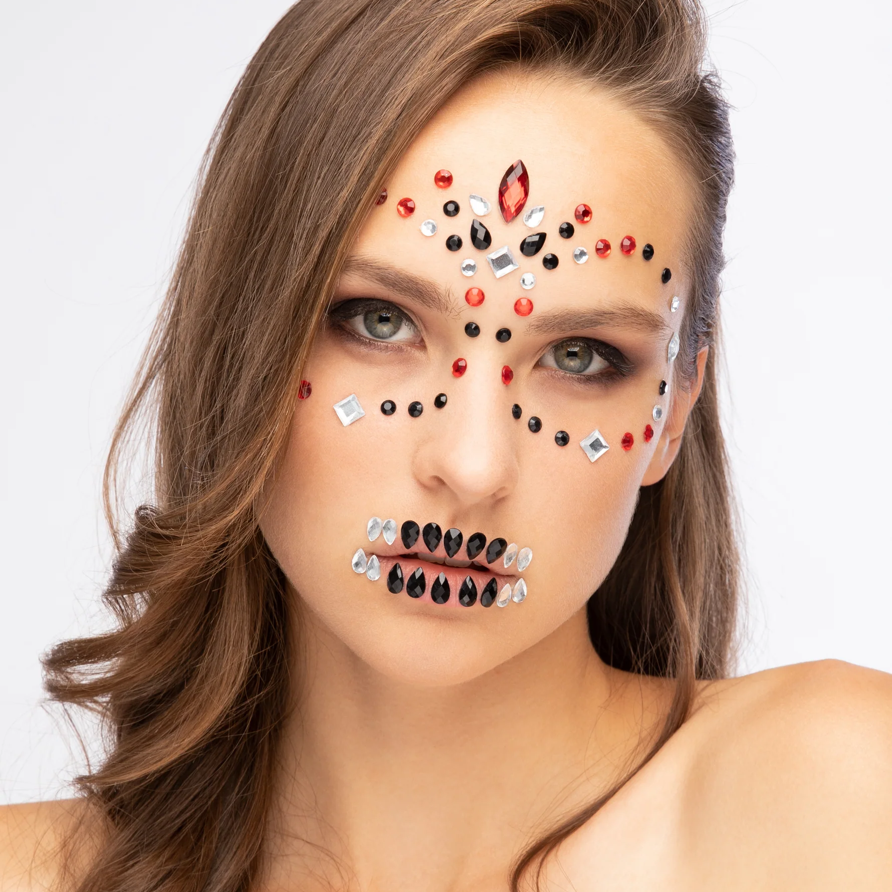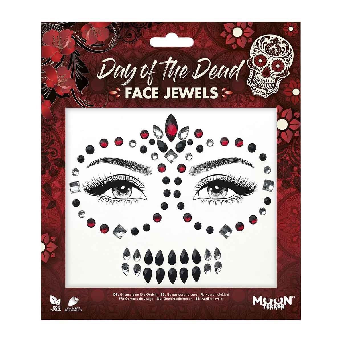 Med Moon Creations Terror kollektion "Day of the dead" kan du förvandla dig till en glittrande och häpnadsväckande dödskalle på de dödas dag! Dessa vackra ansiktsjuveler i klart, rött och svart är redo att fästas direkt på huden runt ögonen, munnen och pannan.