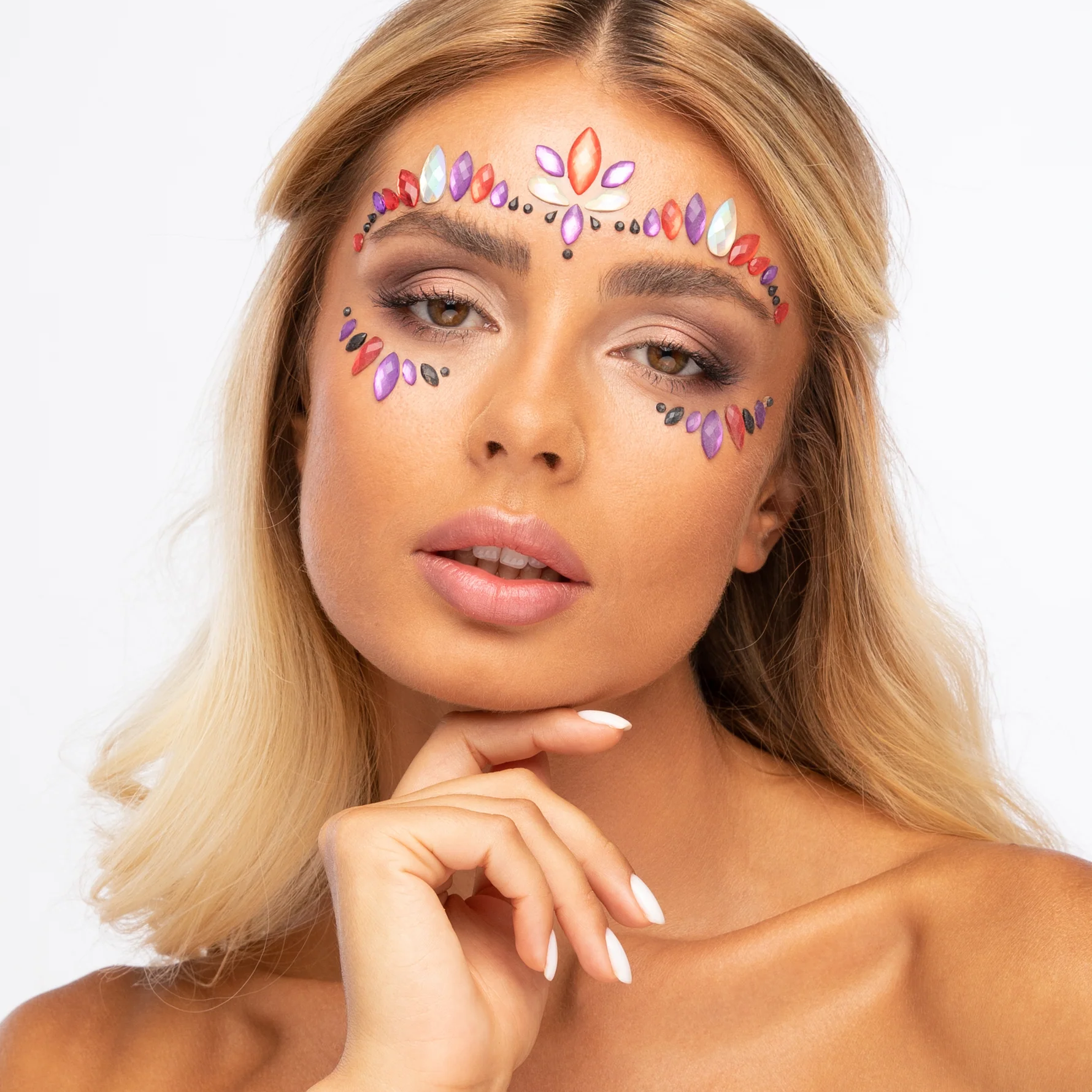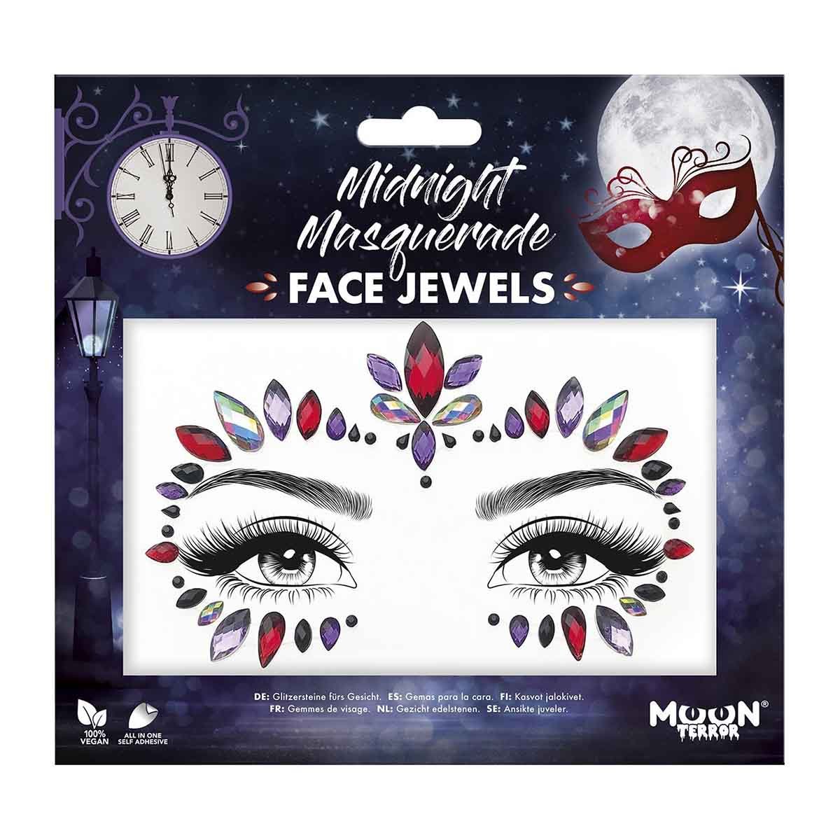 Ta din halloween-sminkning till en ny nivå med ansiktsjuveler från Moon Creations. Midnight Masquerade, en del av Moon Terror kollektionen, har vackra strass stenar i intensiva toner av rött, svart och lila som kommer att få dig att glittra på halloweenfesten.