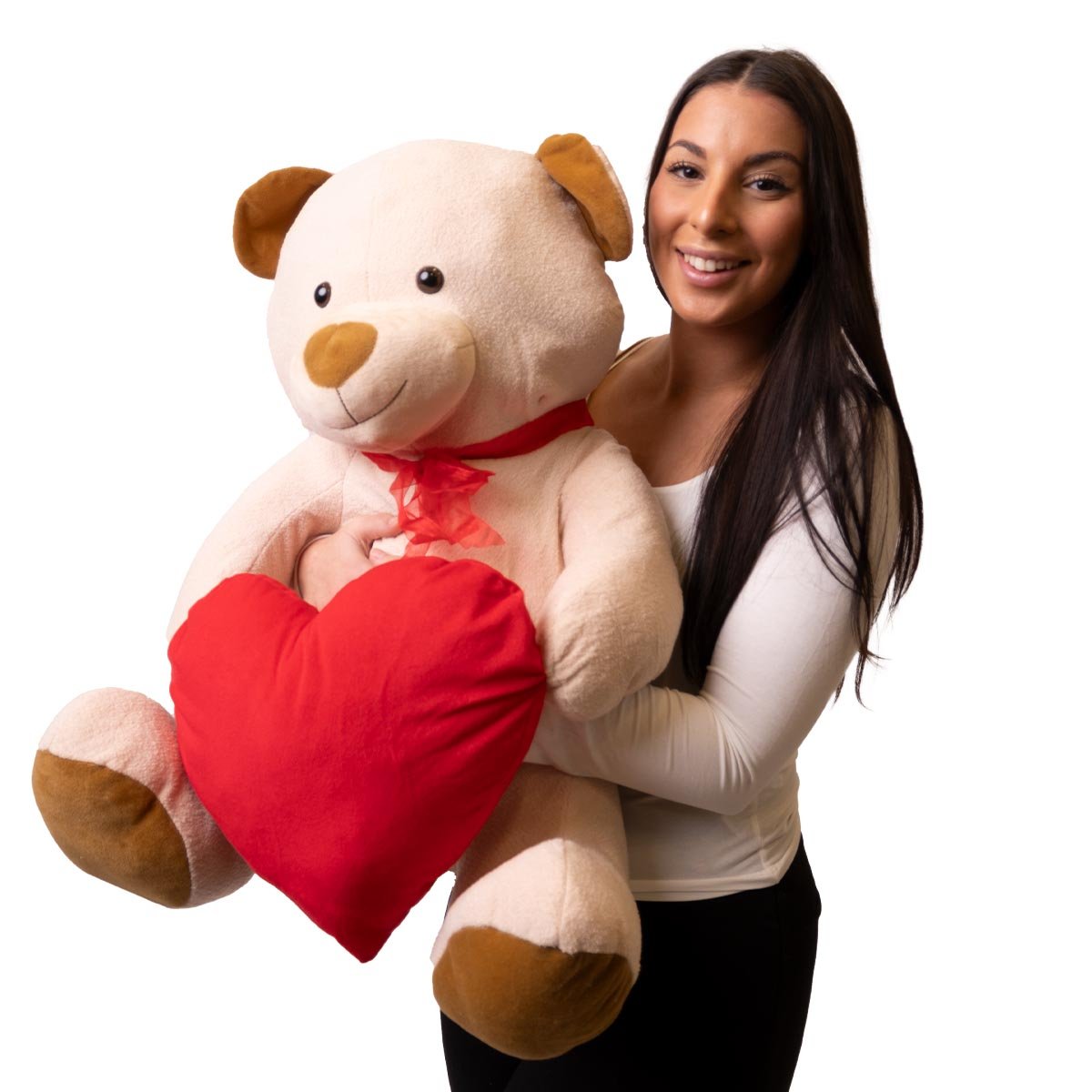 60 cm hög beige/brun nalle som håller i ett stort rött hjärta.