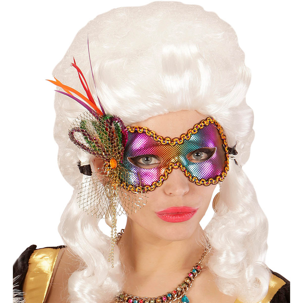 Ge din outfit en gnistrande touch av mystik och glamour med denna ögonmask i metallic regnbågsmönster. Denna mask är den perfekta accessoaren för allt från maskeradbal till temafest eller karneval. Med sina levande färger och detaljer som guldkanter, glittrande nätdekoration och fjädrar, ger den dig en look som garanterat drar blickarna till sig. Masken sitter bekvämt på ansiktet och är lätt att bära under hela festen, oavsett om du dansar natten lång eller minglar med gäster.