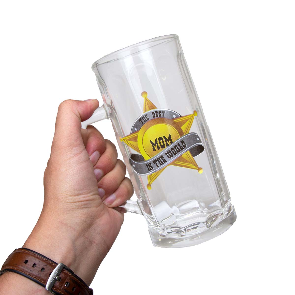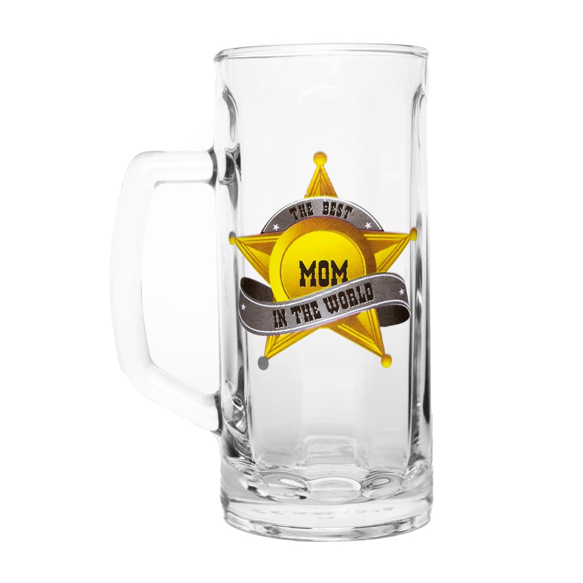 Ölglas med sheriffstjärna och texten "the best mom in the world".