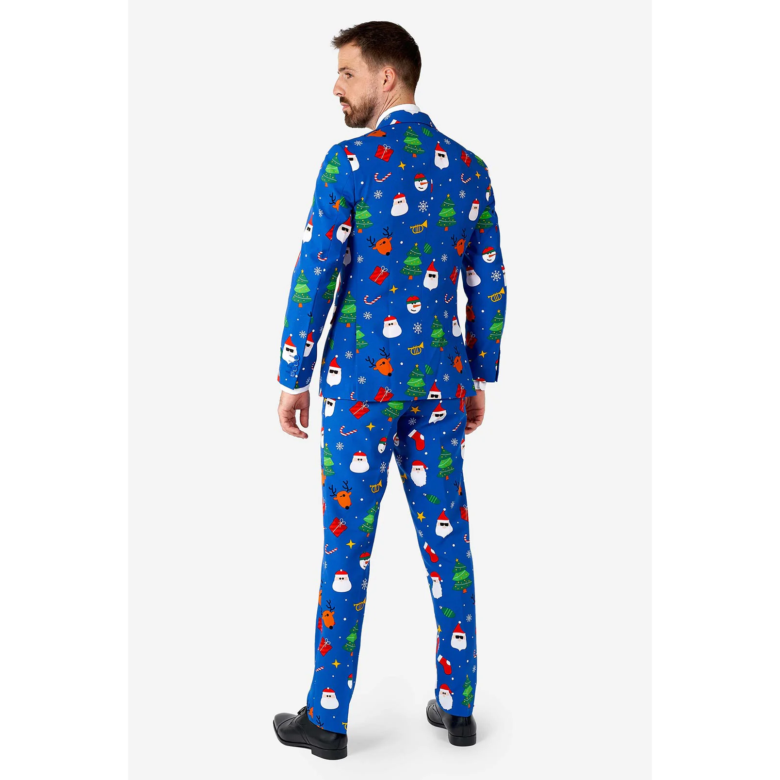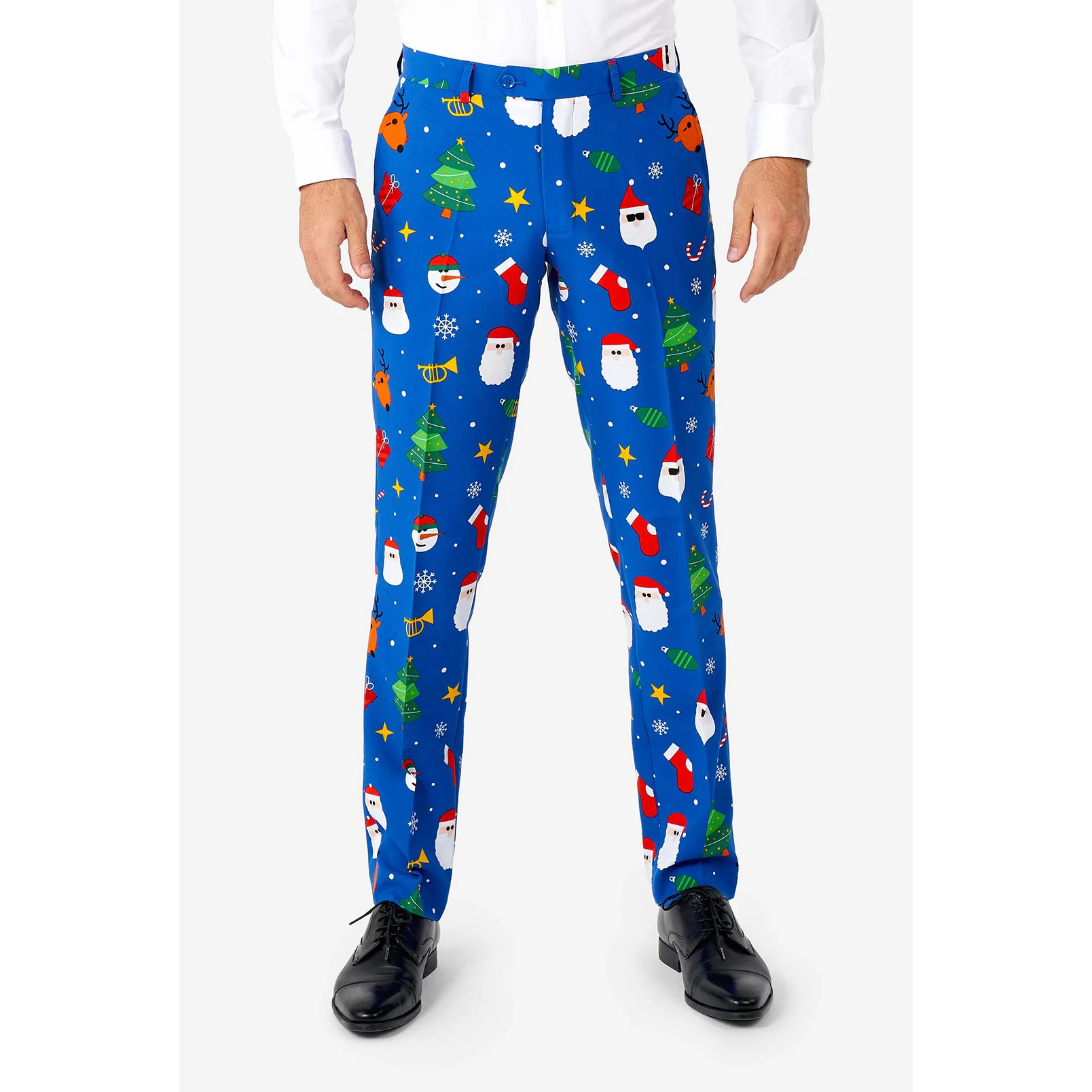 Den här kostymen är skapad för dig som vill lysa upp varje julfirande med färg, humor och en rejäl dos personlighet. Den klara blå bakgrunden ger en modern och livfull känsla, medan de färgstarka julmotiven – tomtar, julgranar, stjärnor, julstrumpor, snöflingor och andra klassiska symboler – gör den till en riktig blickfångare som garanterat väcker leenden.