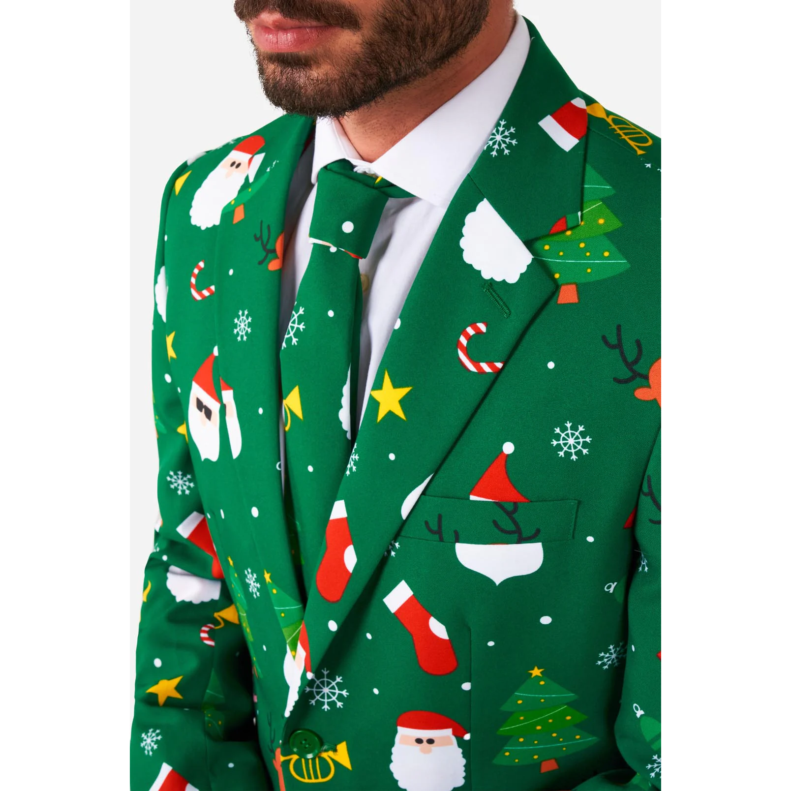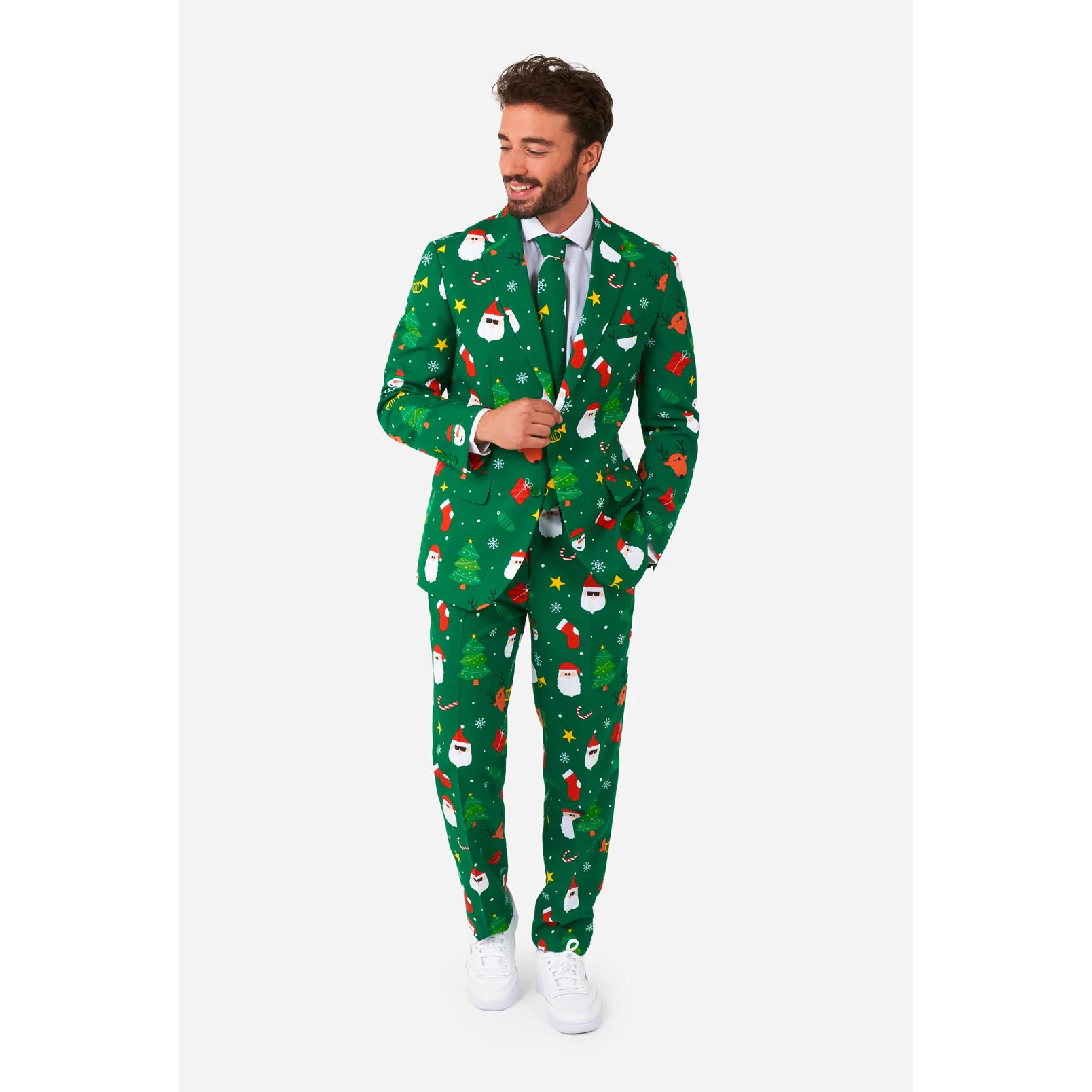 Den här kostymen kombinerar klassisk högtidskänsla med lekfull design och är perfekt för dig som vill sticka ut på årets mest glittrande fester. Den djupgröna bakgrunden skapar en härligt vintrig bas, medan de färgstarka julmotiven – tomtar, julgranar, stjärnor, presenter, snöflingor och fler ikoniska symboler – ger kostymen ett uttryck som både är humoristiskt och stilrent på samma gång.