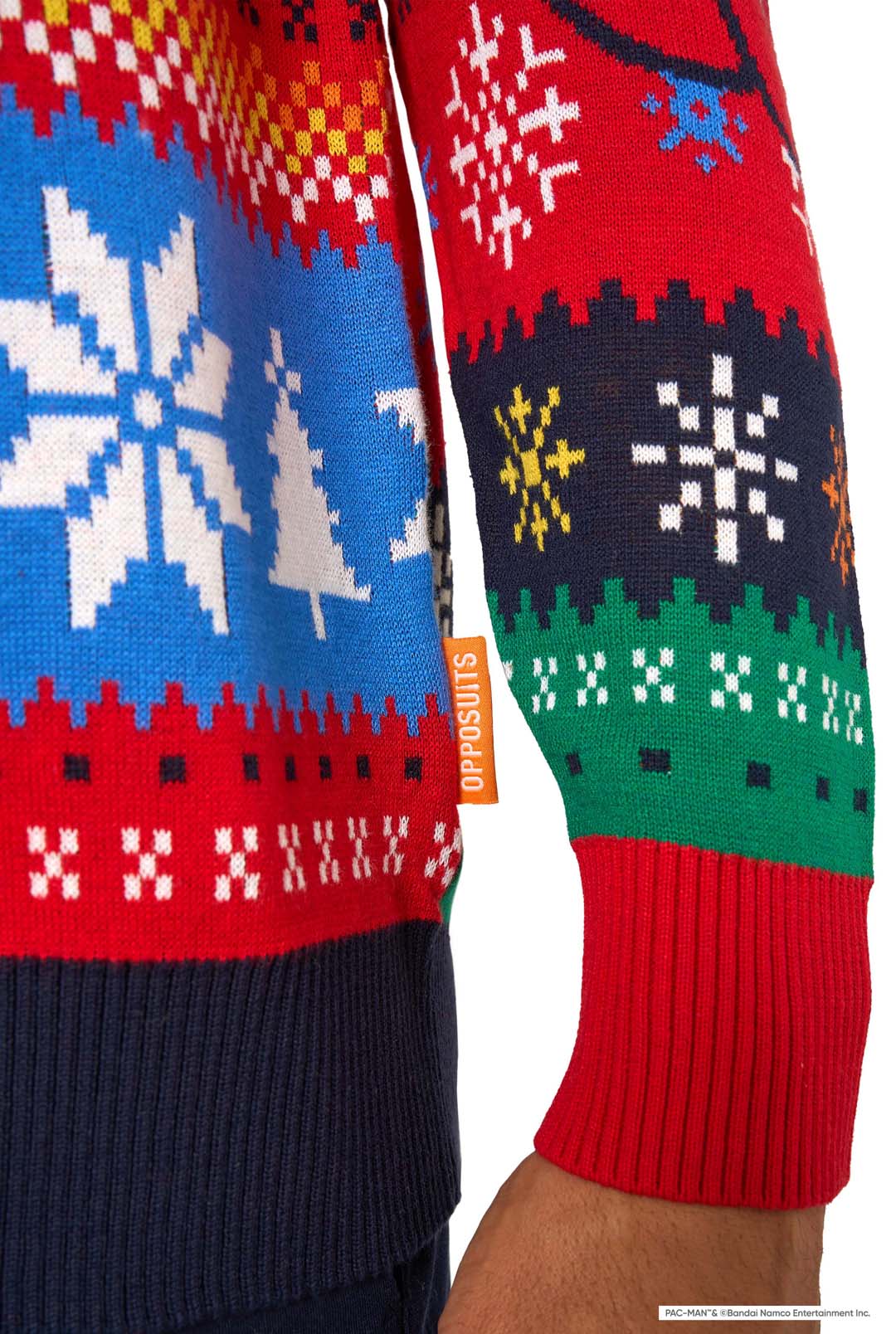 Det vibrerande mönstret i rött, blått, grönt och gult skapar en lekfull helhetsdesign som fångar både retrospelens energi och julens traditionella färger. På tröjan syns Pac-Man i full fart tillsammans med ett av de klassiska spökena, inramat av snöflingor, granar och andra typiska juldetaljer som för tankarna till mysiga vinterkvällar och julens glädje.
