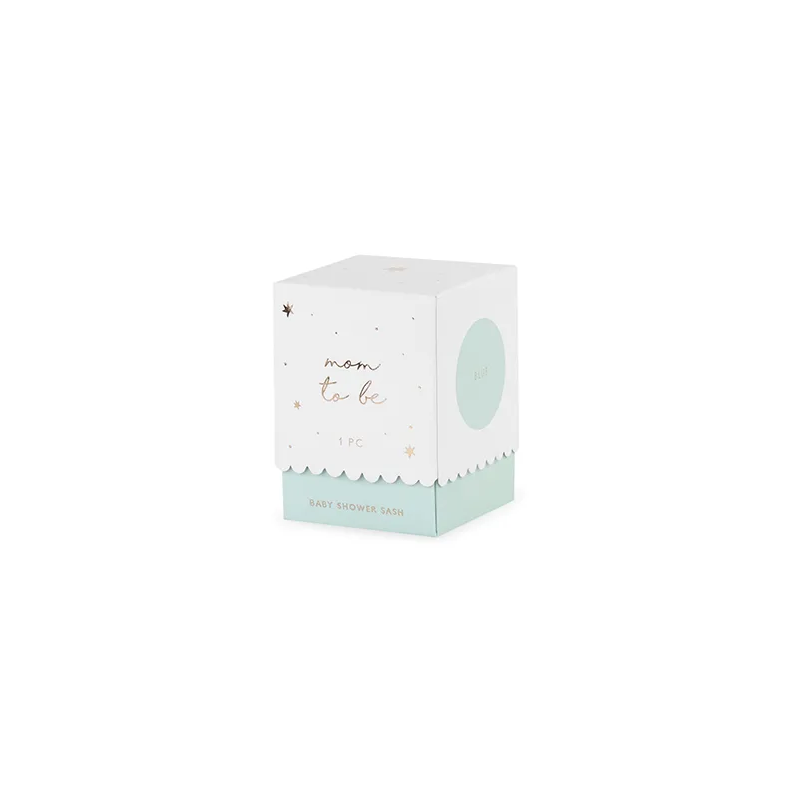 Ge den blivande mamman en extra guldkant på sin babyshower med detta eleganta Mom to Be-band! Det ljusblå bandet pryds av skimrande gulddetaljer och små hjärtan som gör det både sött och stilfullt. Bandet knyts enkelt med det medföljande snöret och blir en perfekt accessoar för att låta huvudpersonen känna sig extra speciell under firandet.