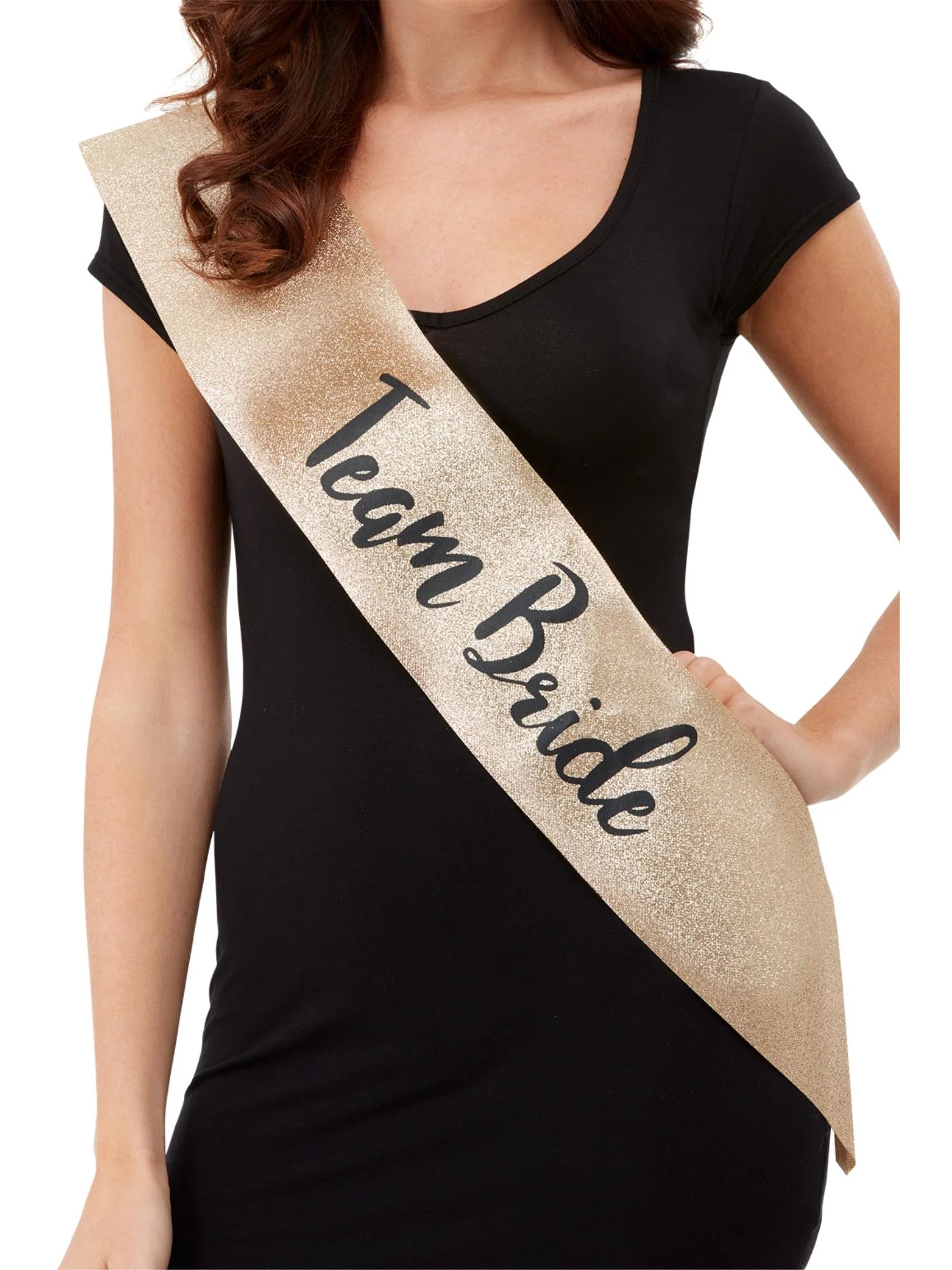 Detta exklusiva glitter-ordensband med texten “Team Bride” är en glamorös accessoar som sätter extra glans på möhippan. Den glittrande finishen ger en lyxig känsla och gör att brudens team verkligen sticker ut under firandet. Perfekt för fest, utekvällar och fotograferingar där ni vill visa er samhörighet med stil. Bandet är bekvämt att bära och passar utmärkt tillsammans med andra brudaccessoarer – ett självklart val för ett festligt och minnesvärt firande av den blivande bruden.