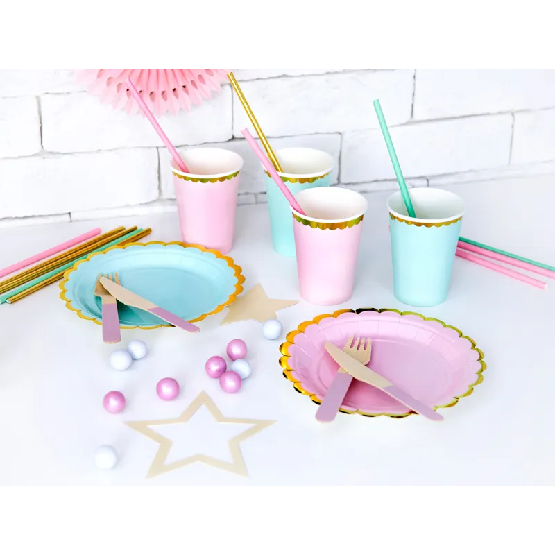 Gör dukningen extra festlig med vår engångsserie i ljusblått eller ljusrosa med guldkant!