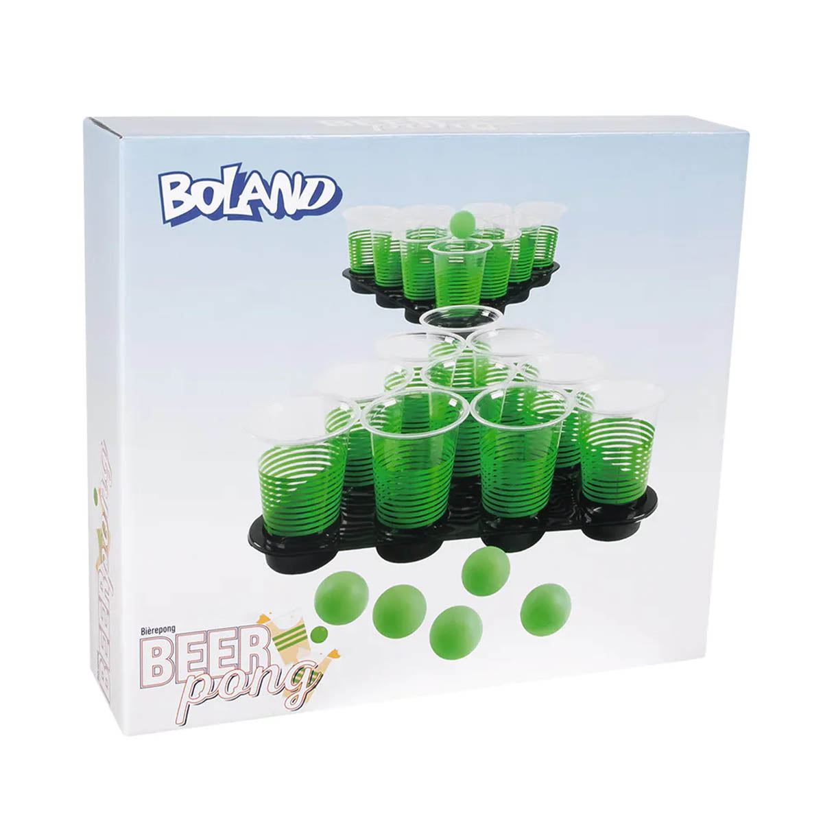 Setet innehåller 12 grönrandiga plastmuggar, 6 gröna bollar och två svarta brickor med fördjupningar som håller allt stadigt på plats. Perfekt när du vill spela utomhus, på ojämnt underlag eller bara undvika kladd och välta glas. Spela 1 mot 1 eller samla ihop hela kompisgänget för en pong-turnering värdig en pokal.